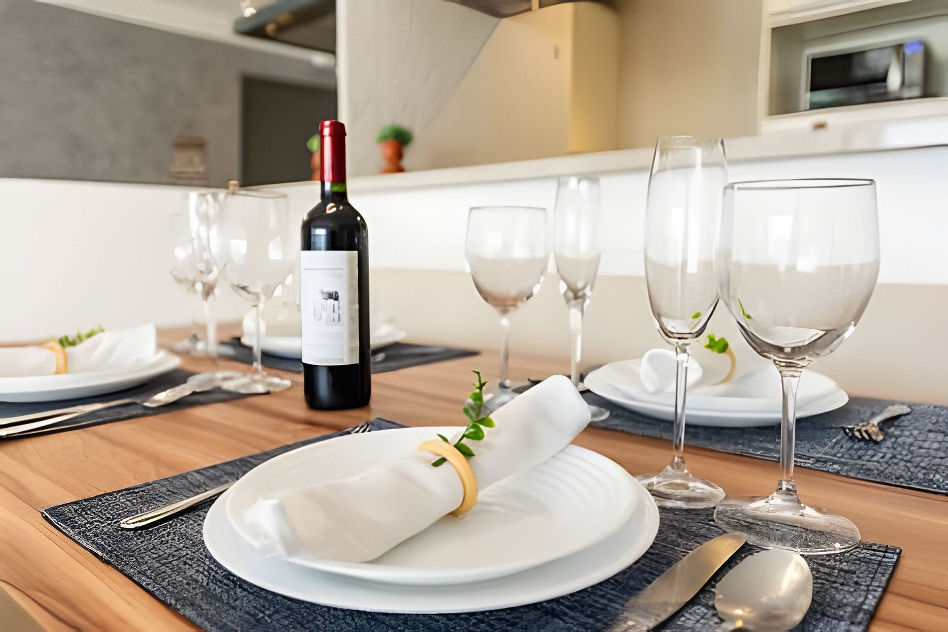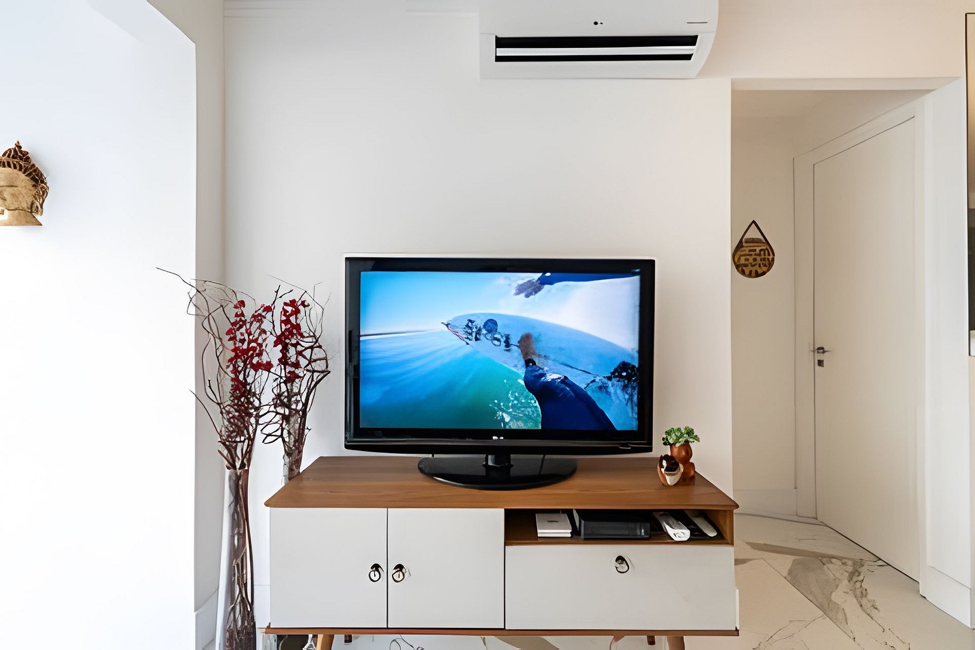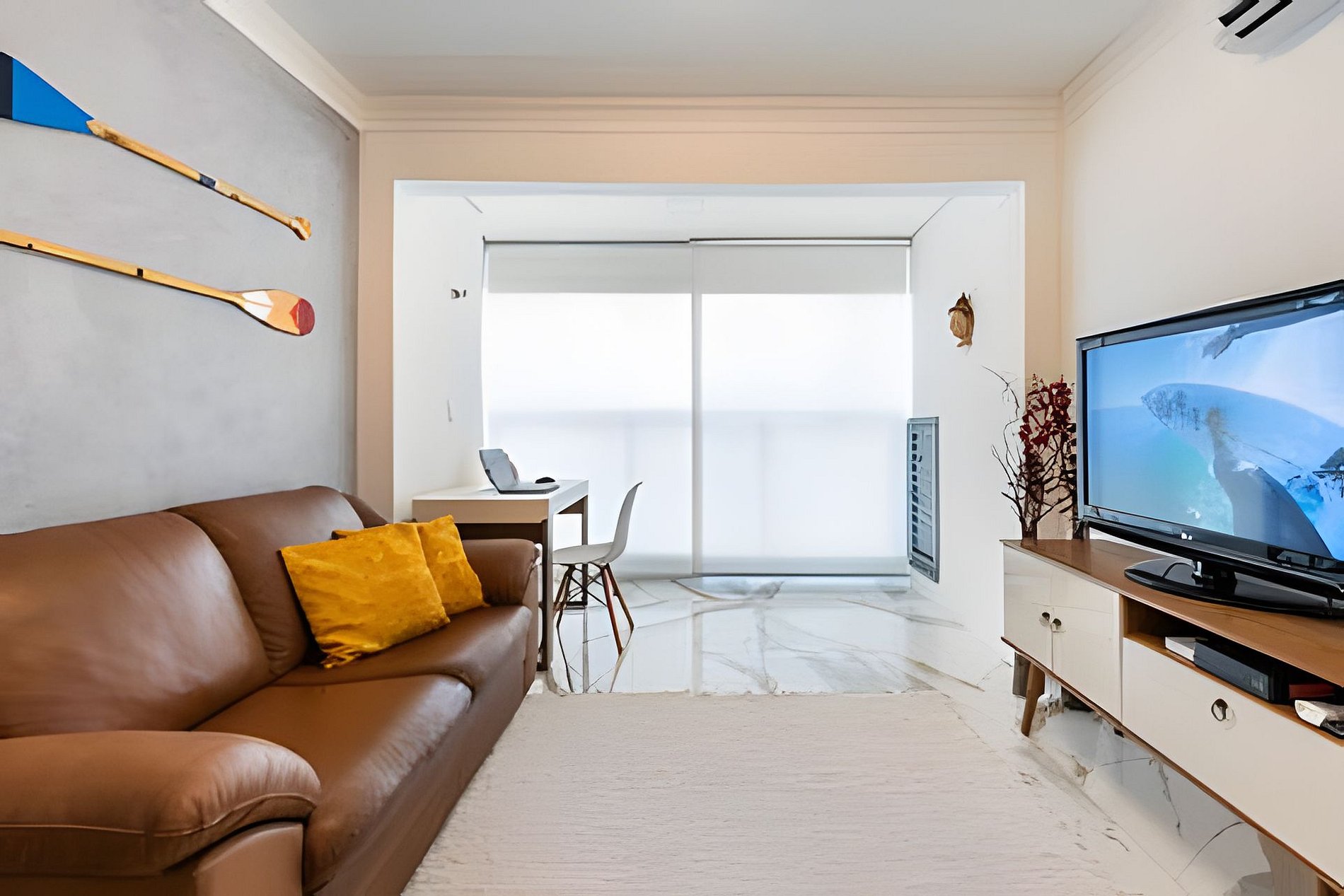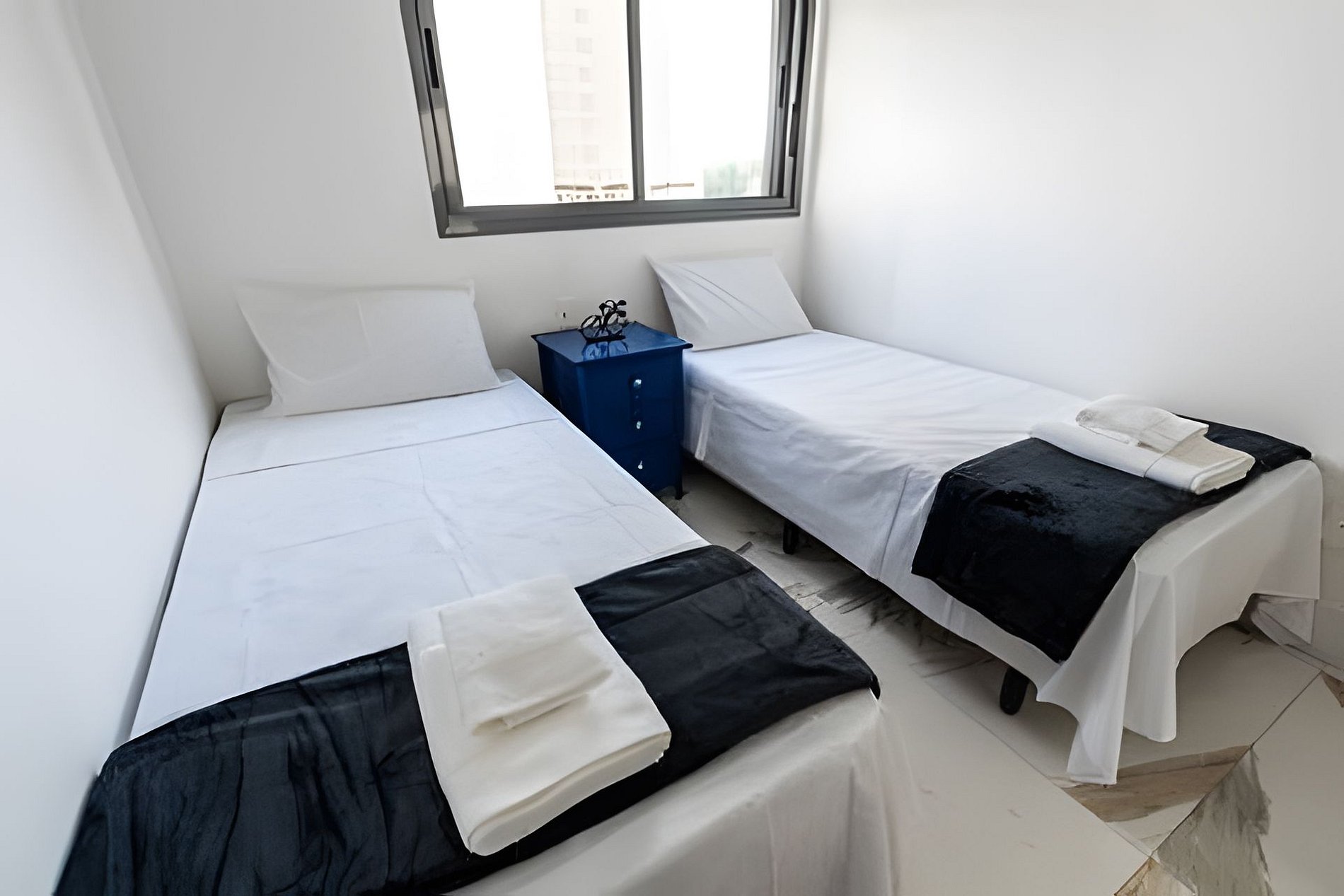 Apto com dois dormitórios, sendo 1 suíte. Suíte com cama casal, segundo quarto com 2 camas de solteiro. Cozinha completa com fogão de indução 4 bocas, forno elétrico, exaustor, geladeira com freezer, cafeteira elétrica Nespresso, além de utensílios de cozinha e panelas. Os banheiros possuem chuveiro de teto e água quente e fria. Ar condicionado na sala e na suíte.