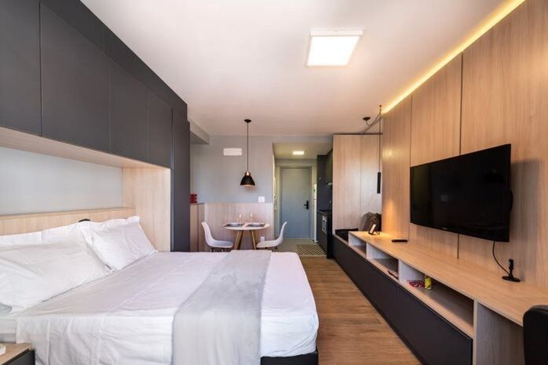 O Estúdio Cab está todo equipado, com uma cama confortável de casal, TV, Wi-Fi de 250MB, ar condicionado, fogão cooktop de indução, geladeira com freezer, micro-ondas, liquidificador, utensílios de cozinha com jogo de panelas. Espaço para home office.