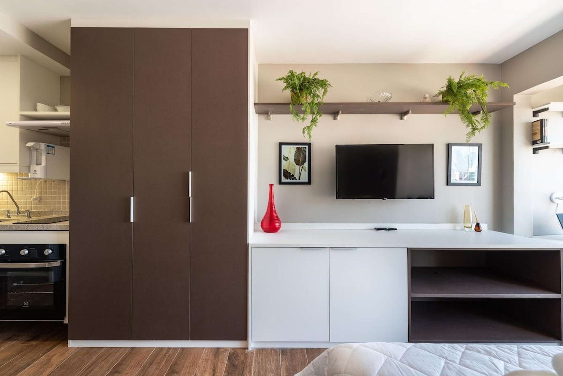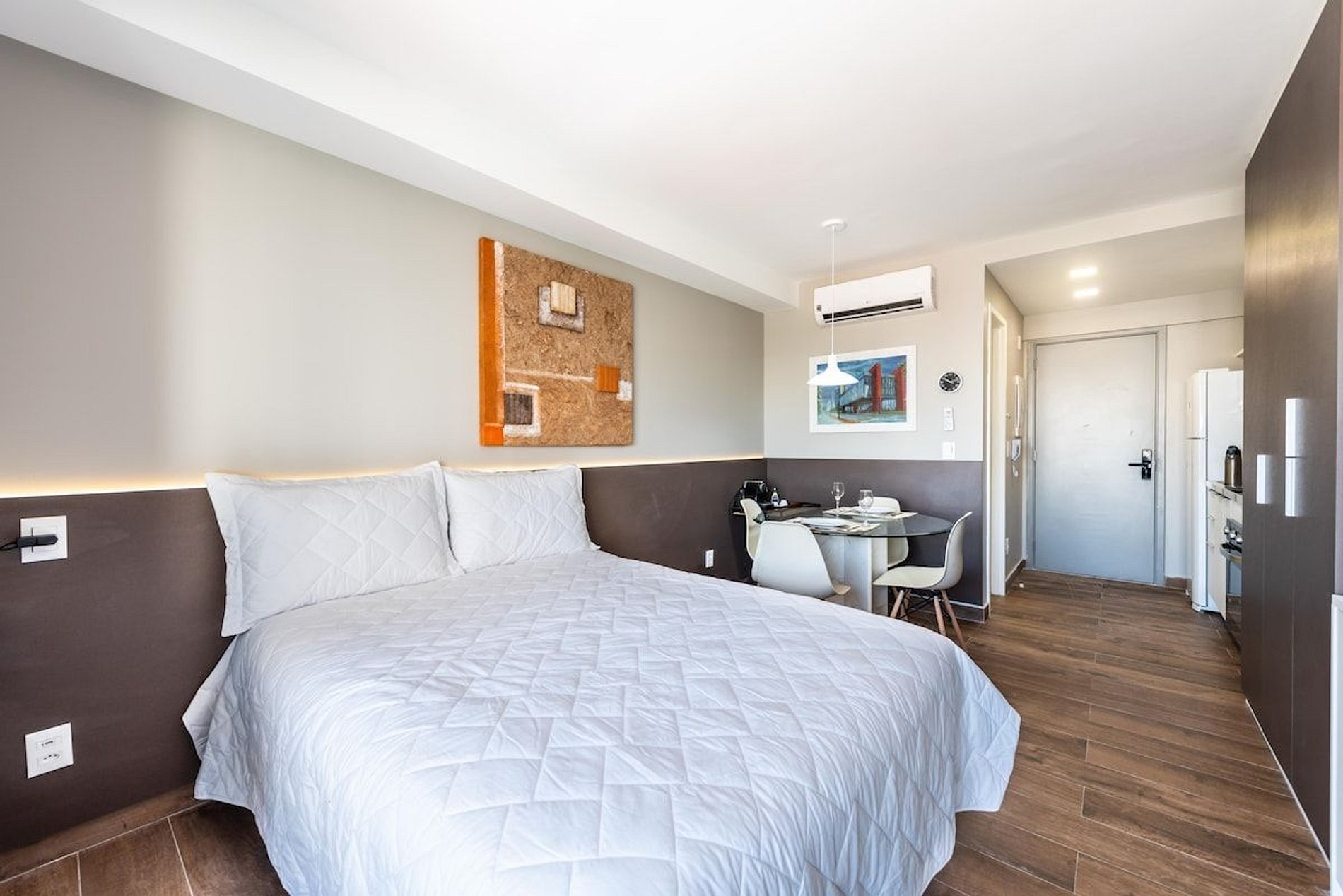 O Estúdio Cab está todo equipado, com uma cama confortável de casal, Smart TV, Wi-Fi de 250MB, Ar condicionado split, fogão cooktop de indução, forno elétrico, geladeira com freezer, micro-ondas, liquidificador, cafeteria de cápsula Nespresso, filtro de água, utensílios de cozinha com jogo de panelas, secador de cabelo, ferro e tábua de passar. Espaço para home office.