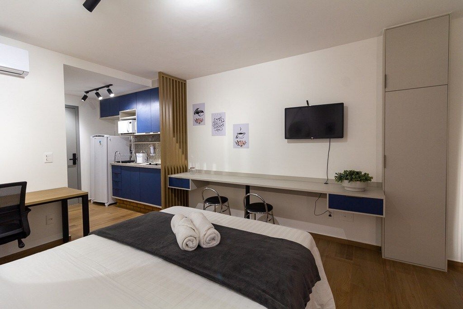 O Estúdio Cab está todo equipado, com uma cama confortável de casal, Smart TV, Wi-Fi de 250MB, Ar condicionado split, fogão cooktop de indução, geladeira com freezer, micro-ondas, liquidificador, utensílios de cozinha com jogo de panelas. Espaço para home office.