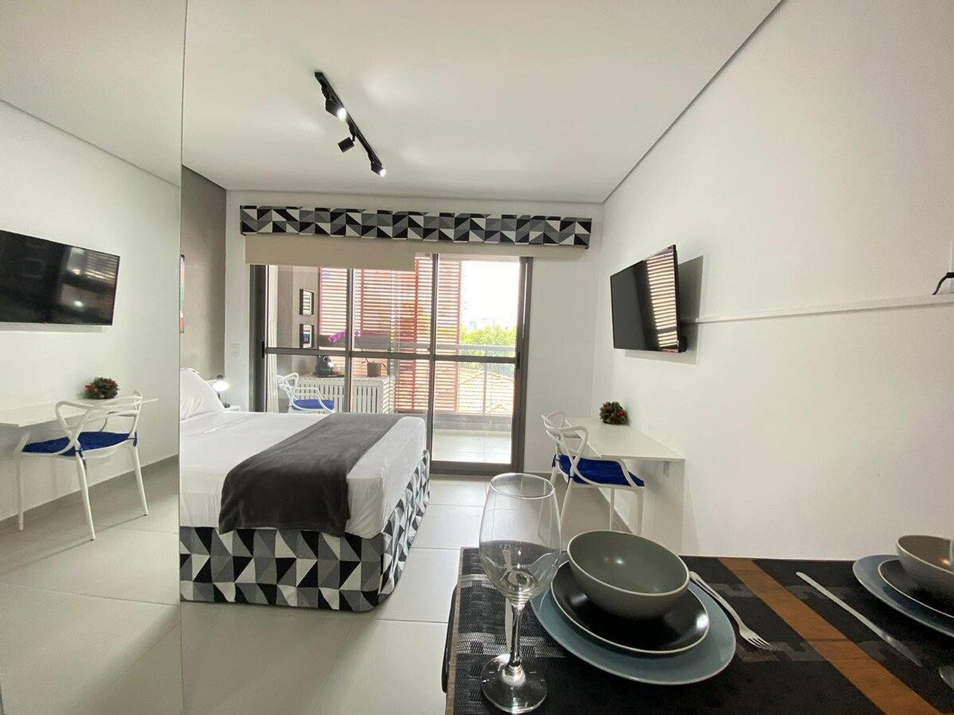 O apartamento conta com uma cama de casal padrão (1,38x1,88). Equipado com Wi-Fi, Smart TV (sem canais a cabo), cooktop, airfryer, geladeira, micro-ondas, ar condicionado, secador de cabelo, utensílios de cozinha, guarda-roupa, mesa para trabalho e blackout nas cortinas.