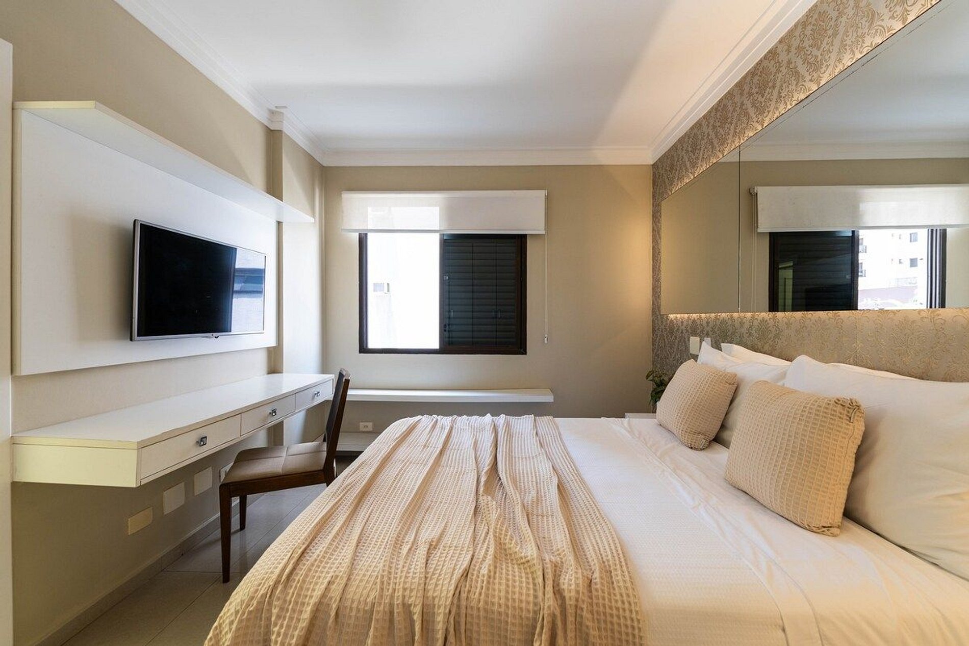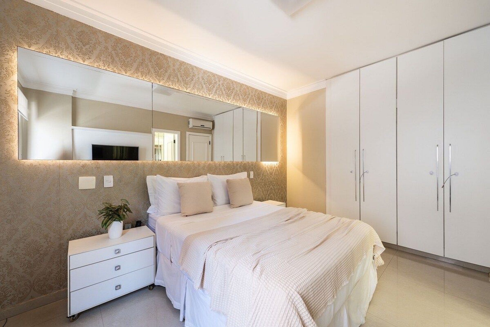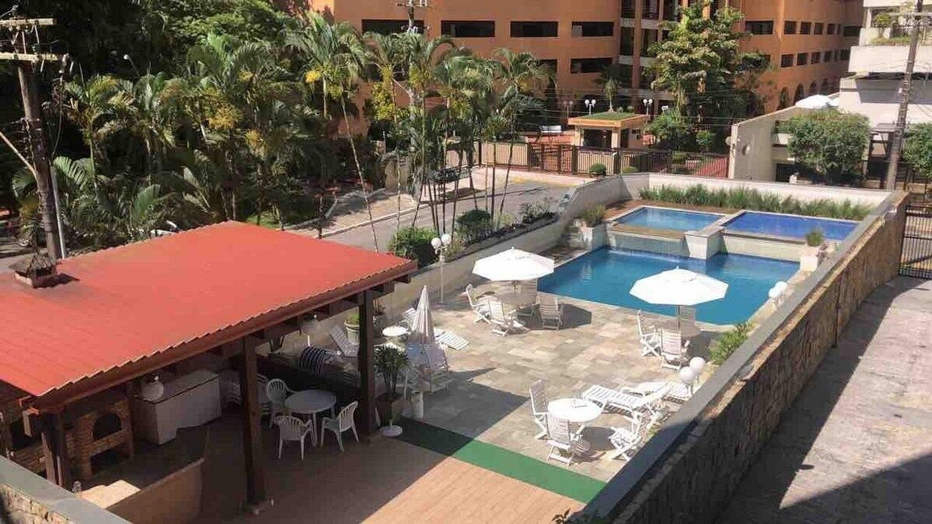 Amplo apartamento em Pitangueiras, Guarujá, com vista para a natureza, a 500m da praia e 1km do shopping. Próximo a restaurantes, padarias e bares. Possui 2 vagas de garagem, serviço de praia e praça em frente para crianças. Sala e suítes com ar condicionado e ventiladores.