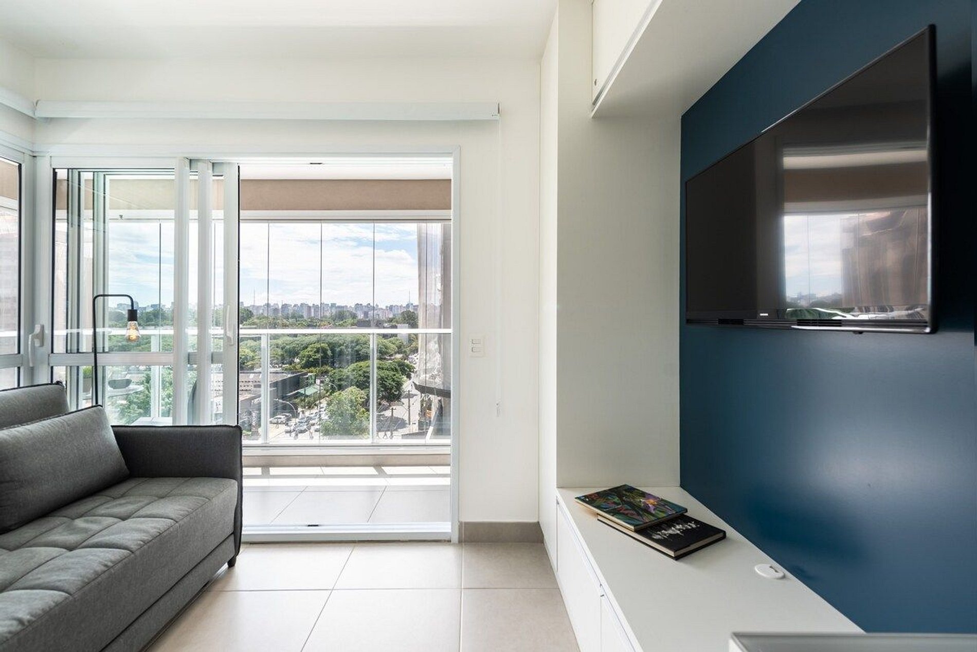 Studio moderno e completo com vista privilegiada da cidade.