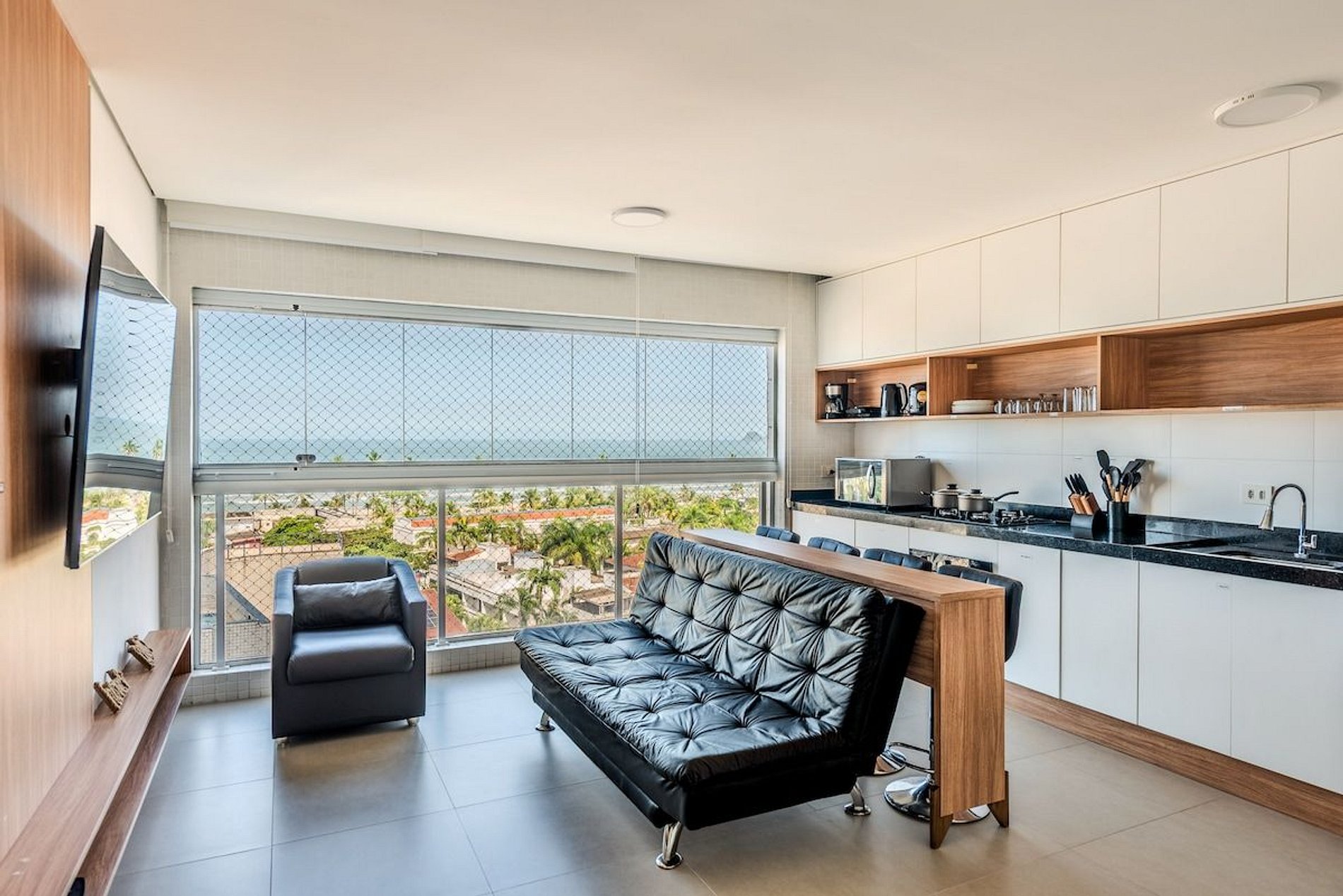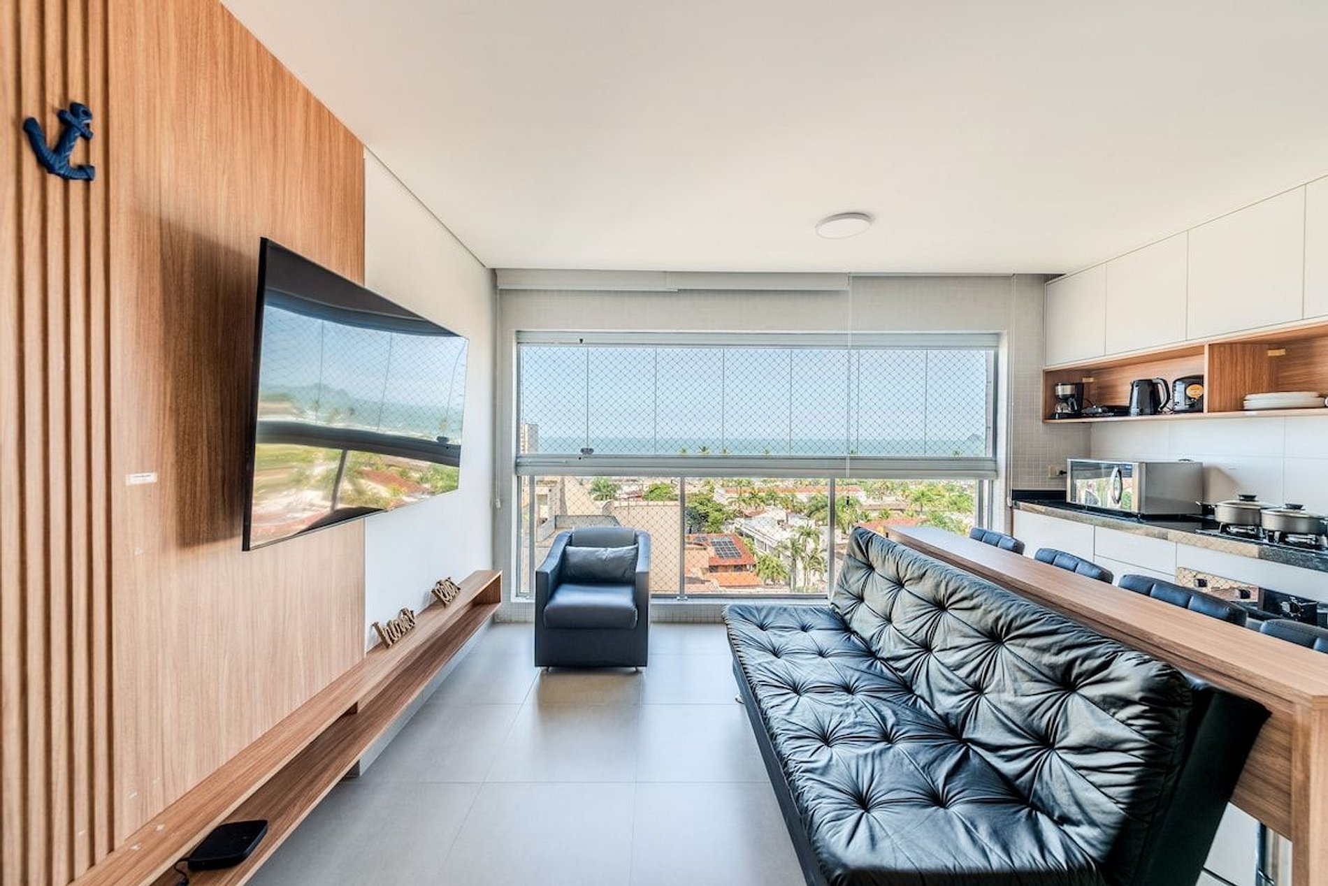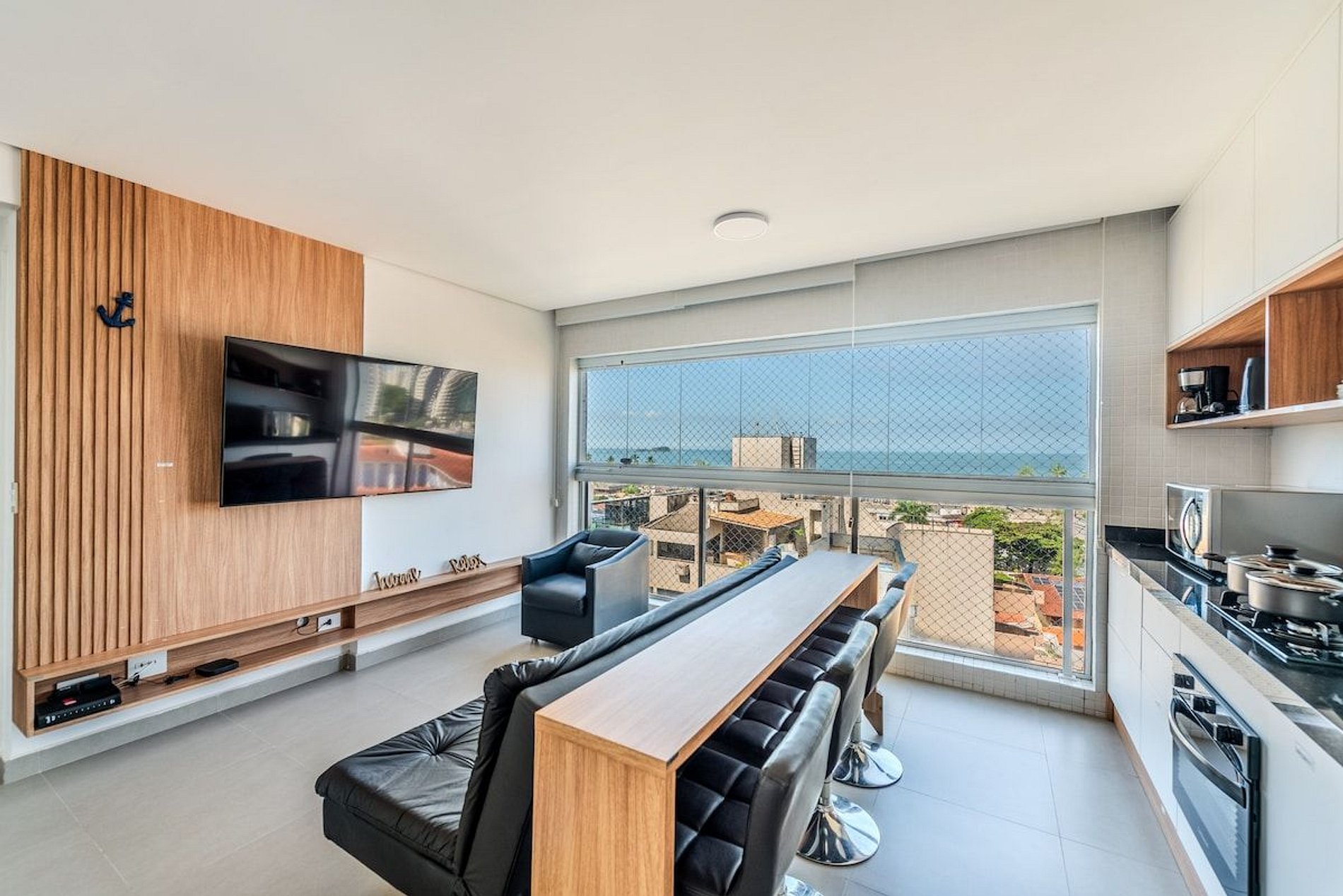 Nosso apartamento é a definição de estilo, modernidade, e conforto, perfeito para aqueles que desejam viver o melhor do Guarujá com classe e praticidade. A unidade foi cuidadosamente decorada para proporcionar um ambiente acolhedor e moderno, com todos os detalhes pensados para seu bem-estar. • Ambiente Moderno e Aconchegante, combinando design contemporâneo e conforto, criando um espaço ideal para relaxar após um dia de praia. • Janelas com persianas motorizadas, manuseio por controle remoto. • Máquina de lavar roupa e secar. • Cozinha Equipada: Com fogão, forno, geladeira, micro-ondas e todos os utensílios necessários para preparar suas refeições favoritas. • Espaço para Trabalho e Refeições Rápidas em uma bancada confortável para quem precisa trabalhar remotamente. • Banheiro moderno e espaçoso com chuveiro de alta pressão. • Check-in fácil e descomplicado, com acesso pela portaria do prédio.