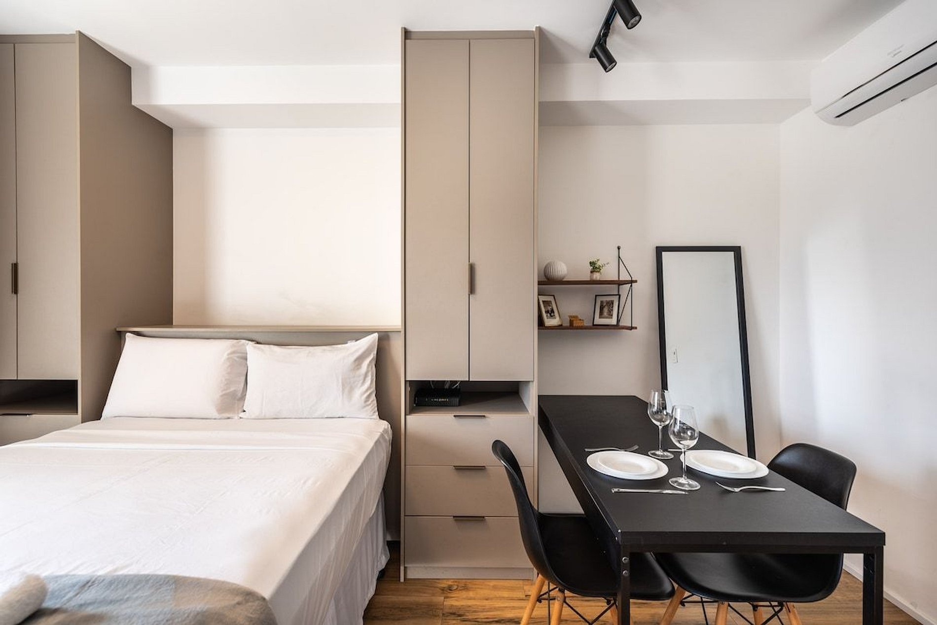 O Estúdio Cab está todo equipado, com uma cama confortável de casal, Smart TV, Wi-Fi de 250MB, Ar condicionado split, fogão cooktop de indução, geladeira com freezer, micro-ondas e utensílios de cozinha com jogo de panelas.