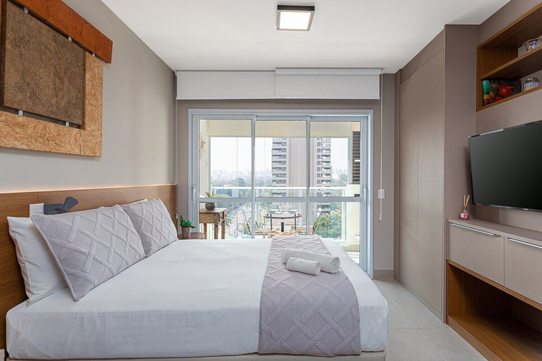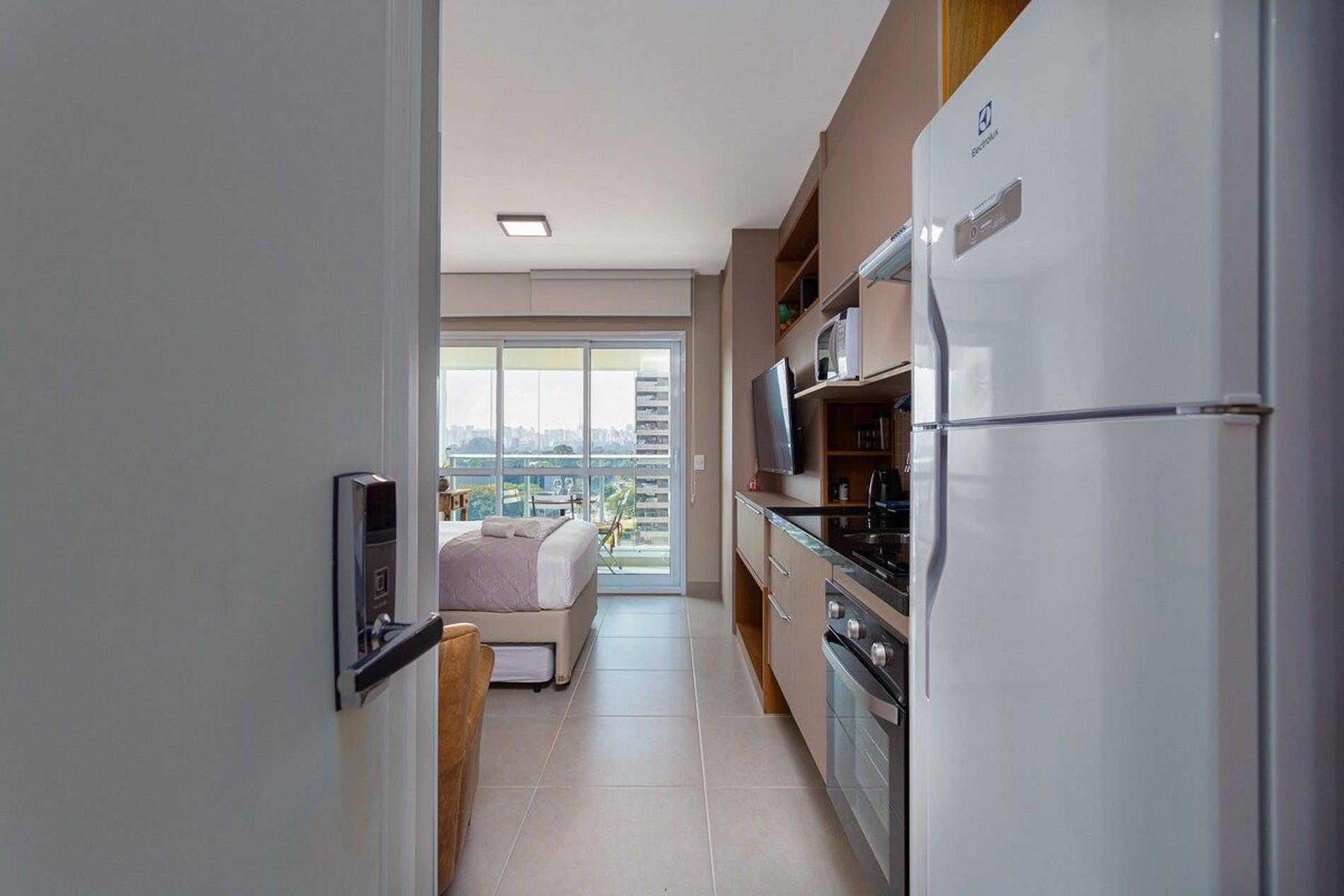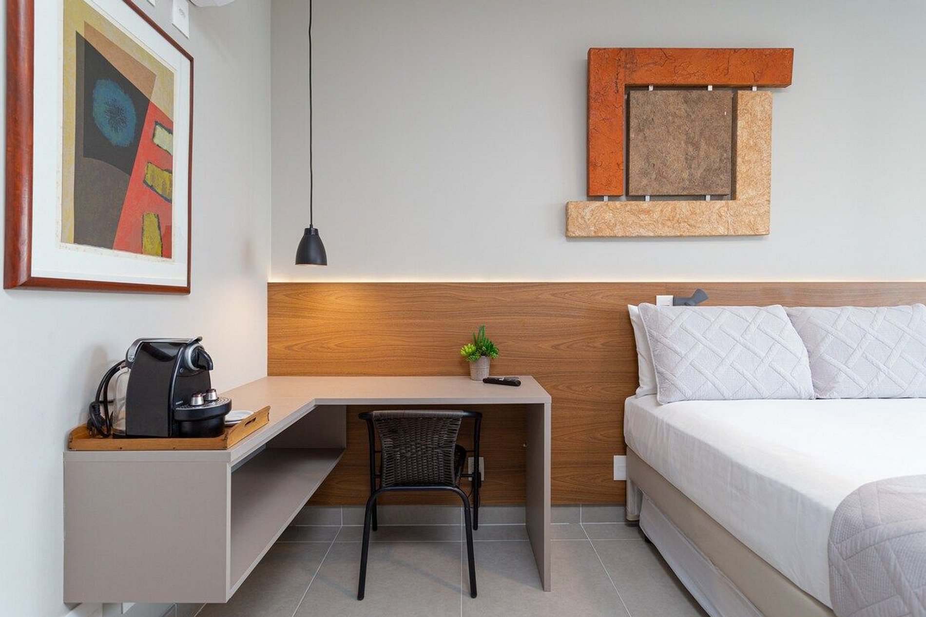Equipado com Wi-Fi, Smart TV (sem canais a cabo), cooktop, forno, geladeira, micro-ondas, liquidificador, cafeteria de cápsula Nespresso, filtro de água, ar condicionado, secador de cabelo, ferro e tábua de passar, utensílios de cozinha, guarda-roupa com cabides, mesa para trabalho e blackout nas cortinas.