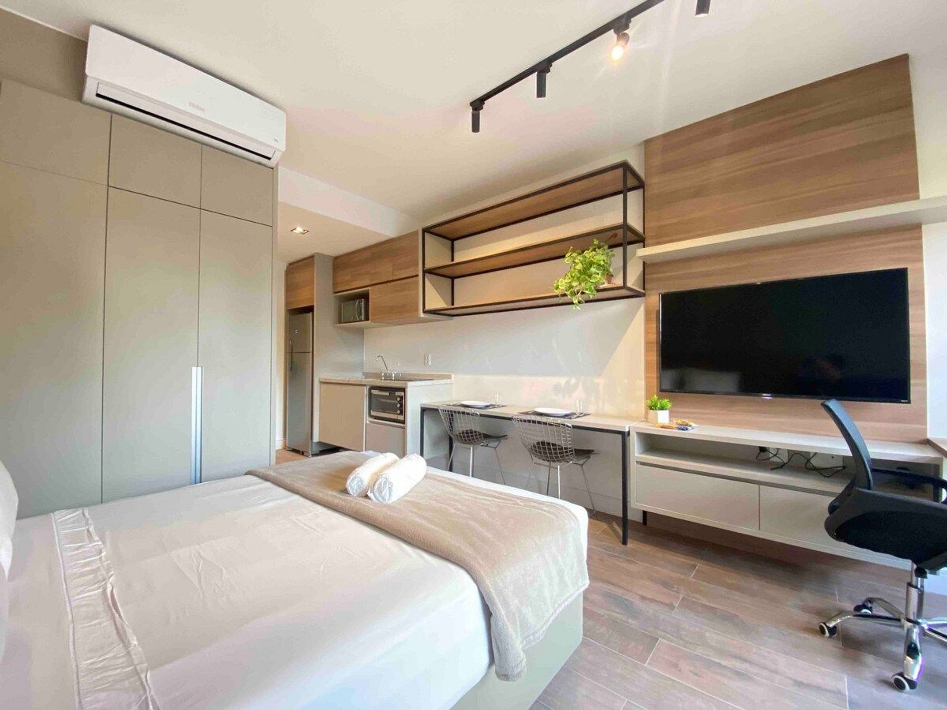 O Estúdio Cab possui janelas anti ruído e porta também com antirruído, está todo equipado, com uma cama confortável de casal e uma bicama de solteiro saindo do box da cama de casal, Smart TV 50", Wi-Fi de 250MB, Ar condicionado split, fogão cooktop de indução, forno elétrico, geladeira com freezer, micro-ondas, cafeteira térmica e coador de café , utensílios de cozinha com jogo de panelas, secador de cabelo, ferro de passar. Espaço para home office.