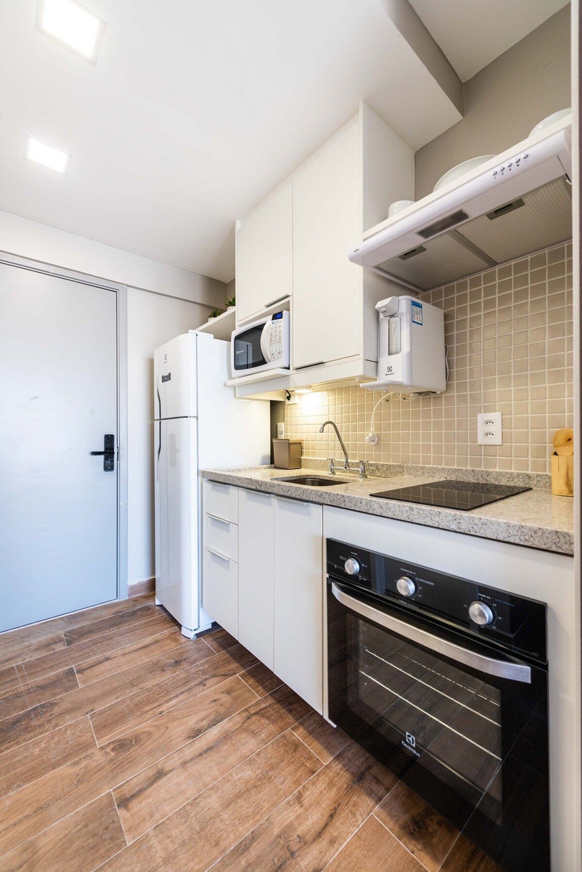 O Estúdio Cab está todo equipado, com uma cama confortável de casal, Smart TV, Wi-Fi de 250MB, Ar condicionado split, fogão cooktop de indução, forno elétrico, geladeira com freezer, micro-ondas, liquidificador, cafeteria de cápsula Nespresso, filtro de água, utensílios de cozinha com jogo de panelas, secador de cabelo, ferro e tábua de passar. Espaço para home office.