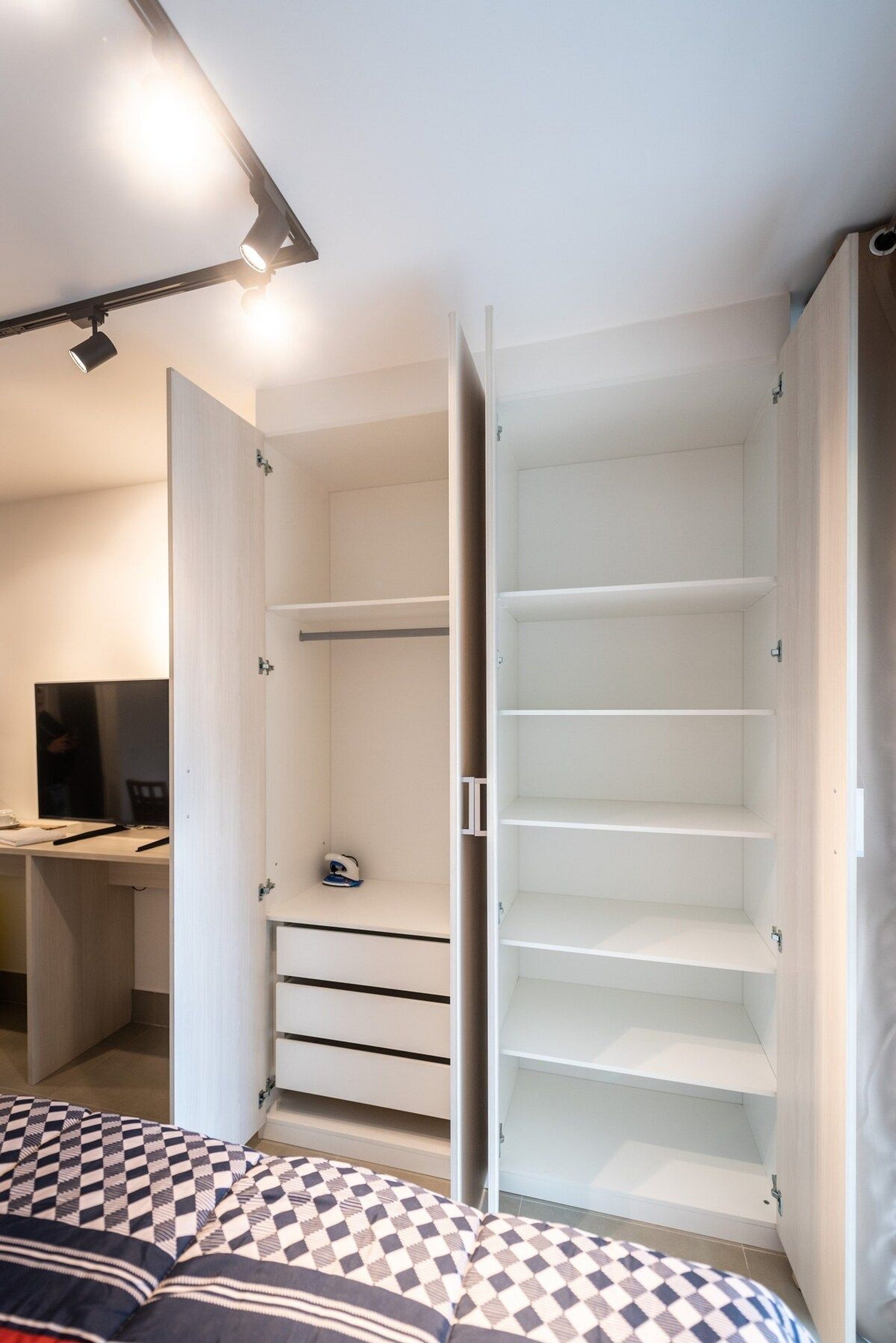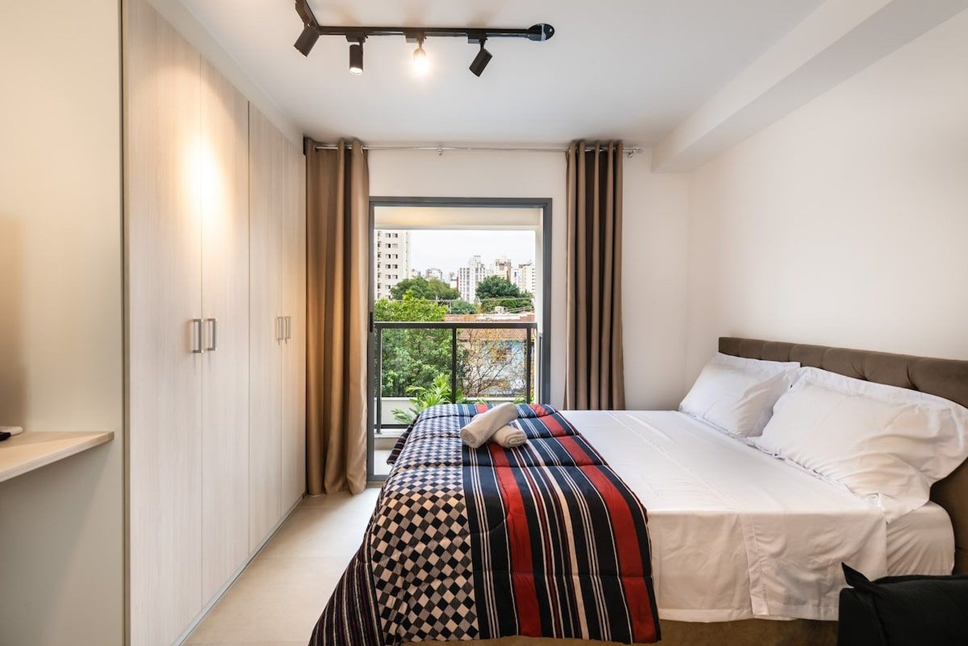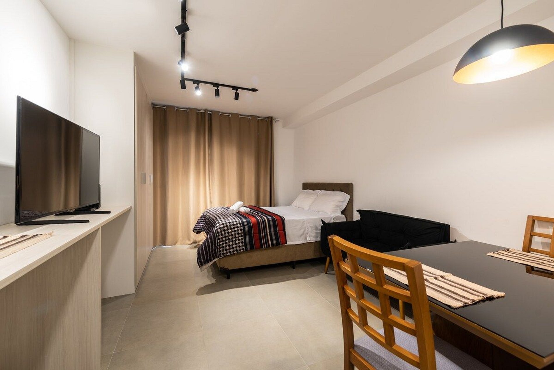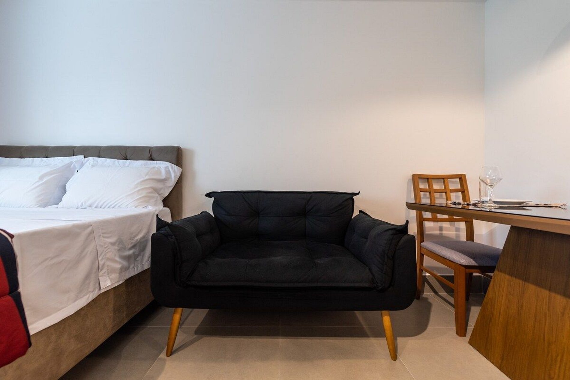 O Studio de 26m², possui uma cama de casal, um sofázinho, mesa de jantar para 2 pessoas, cozinha completa com fogão de indução (2 bocas), forno, filtro de água, geladeira com freezer, cafeteira Nespresso, chaleira elétrica, ferro de passar roupa, secador, guarda-roupa com cabides e 4 travesseiros.