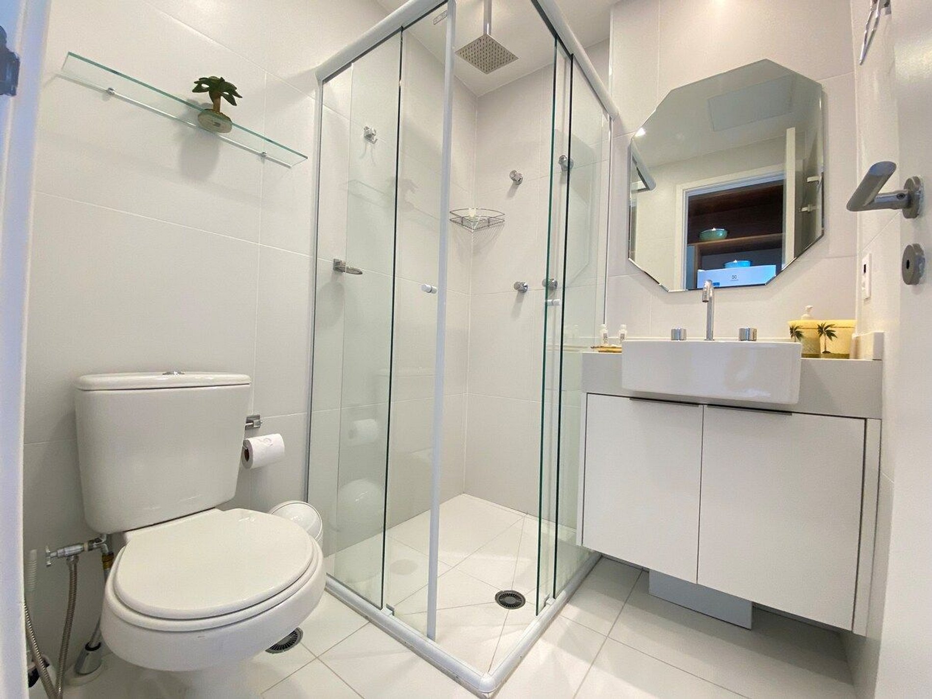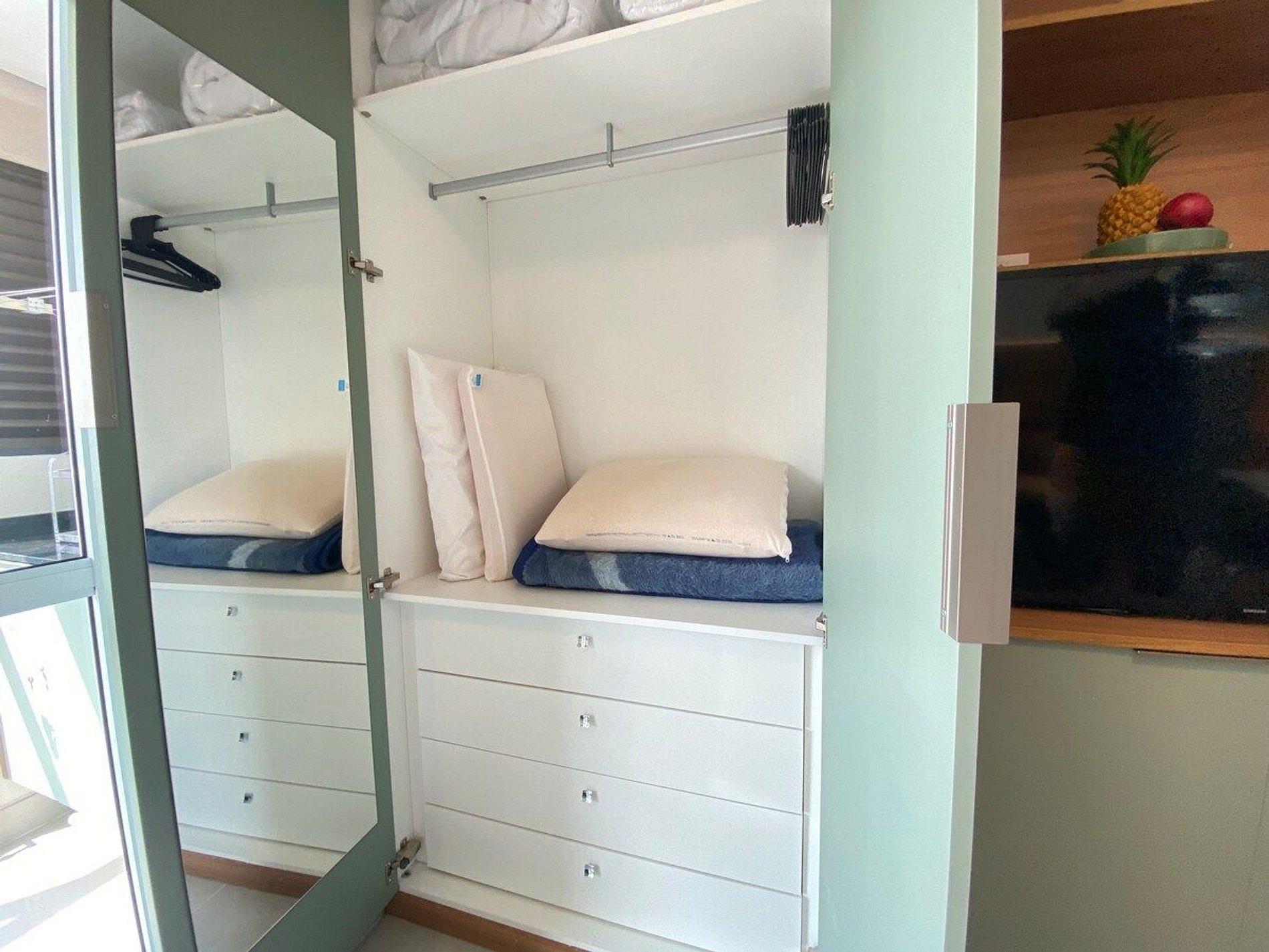 O apartamento conta com uma cama de casal padrão com colchão de alta qualidade, além de uma de solteiro estilo gaveta para acomodar o terceiro hóspede. Equipado com Wi-Fi, Smart TV (sem canais a cabo), cooktop, forno, geladeira, micro-ondas, liquidificador, filtro de água, ar condicionado, secador de cabelo, ferro e tábua de passar, utensílios de cozinha, guarda-roupa com cabides, mesa para trabalho e blackout nas cortinas.