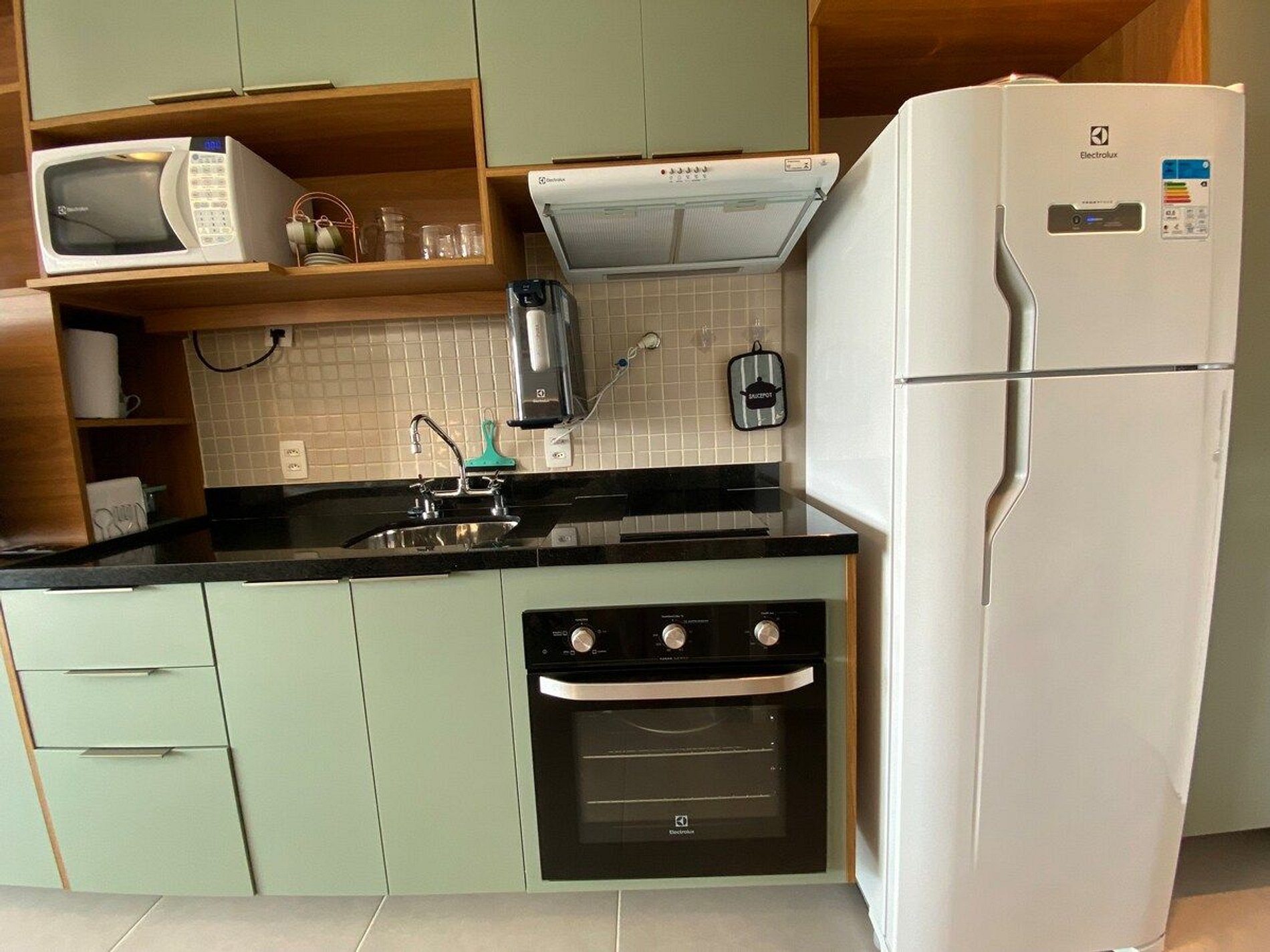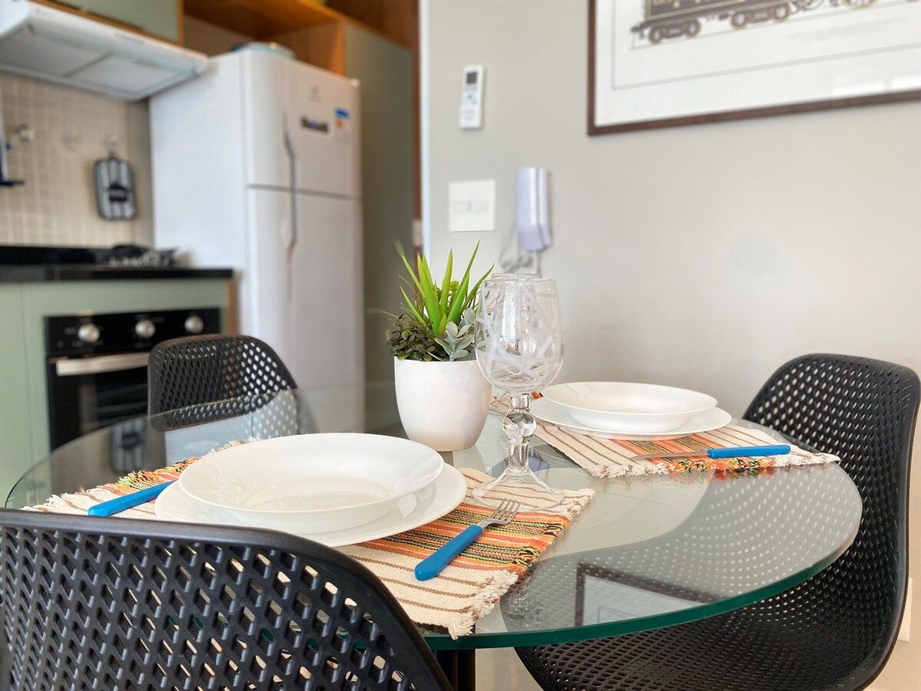 O apartamento conta com uma cama de casal padrão com colchão de alta qualidade, além de uma de solteiro estilo gaveta para acomodar o terceiro hóspede. Equipado com Wi-Fi, Smart TV (sem canais a cabo), cooktop, forno, geladeira, micro-ondas, liquidificador, filtro de água, ar condicionado, secador de cabelo, ferro e tábua de passar, utensílios de cozinha, guarda-roupa com cabides, mesa para trabalho e blackout nas cortinas.