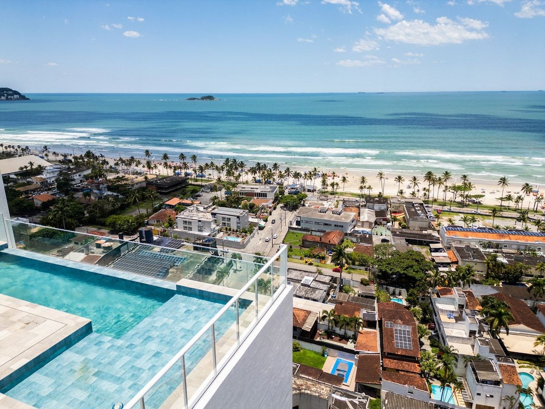 Piscina com borda infinita na cobertura, com vista para a praia.