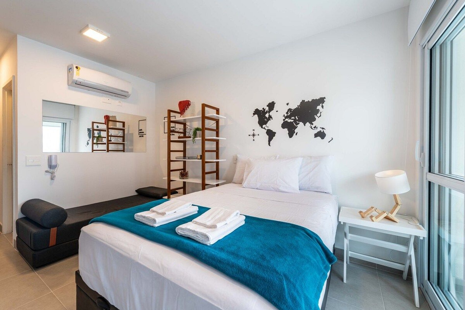 O apartamento conta com uma cama de casal padrão com colchão de alta qualidade, além de um sofá cama de solteiro para o terceiro hóspede.