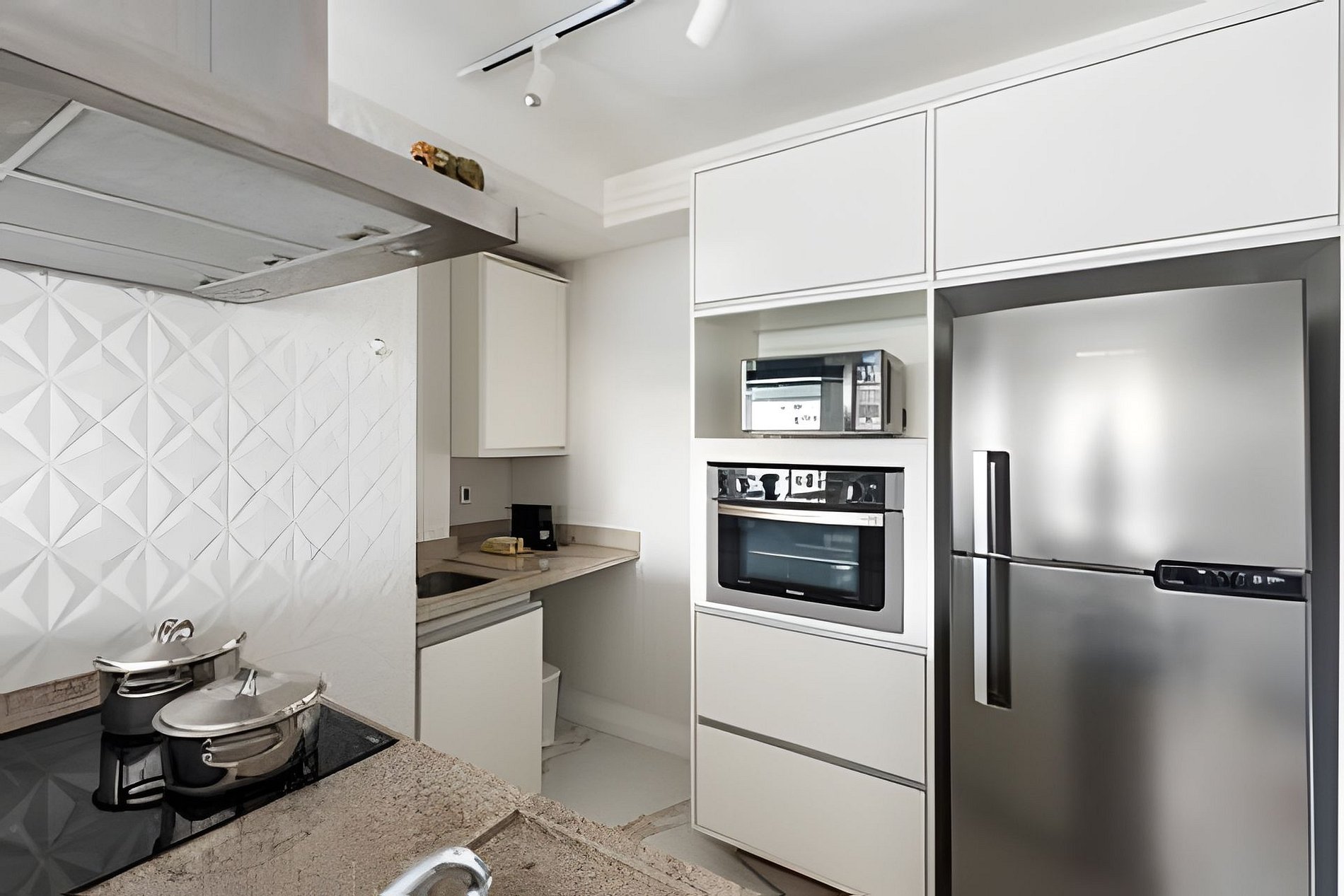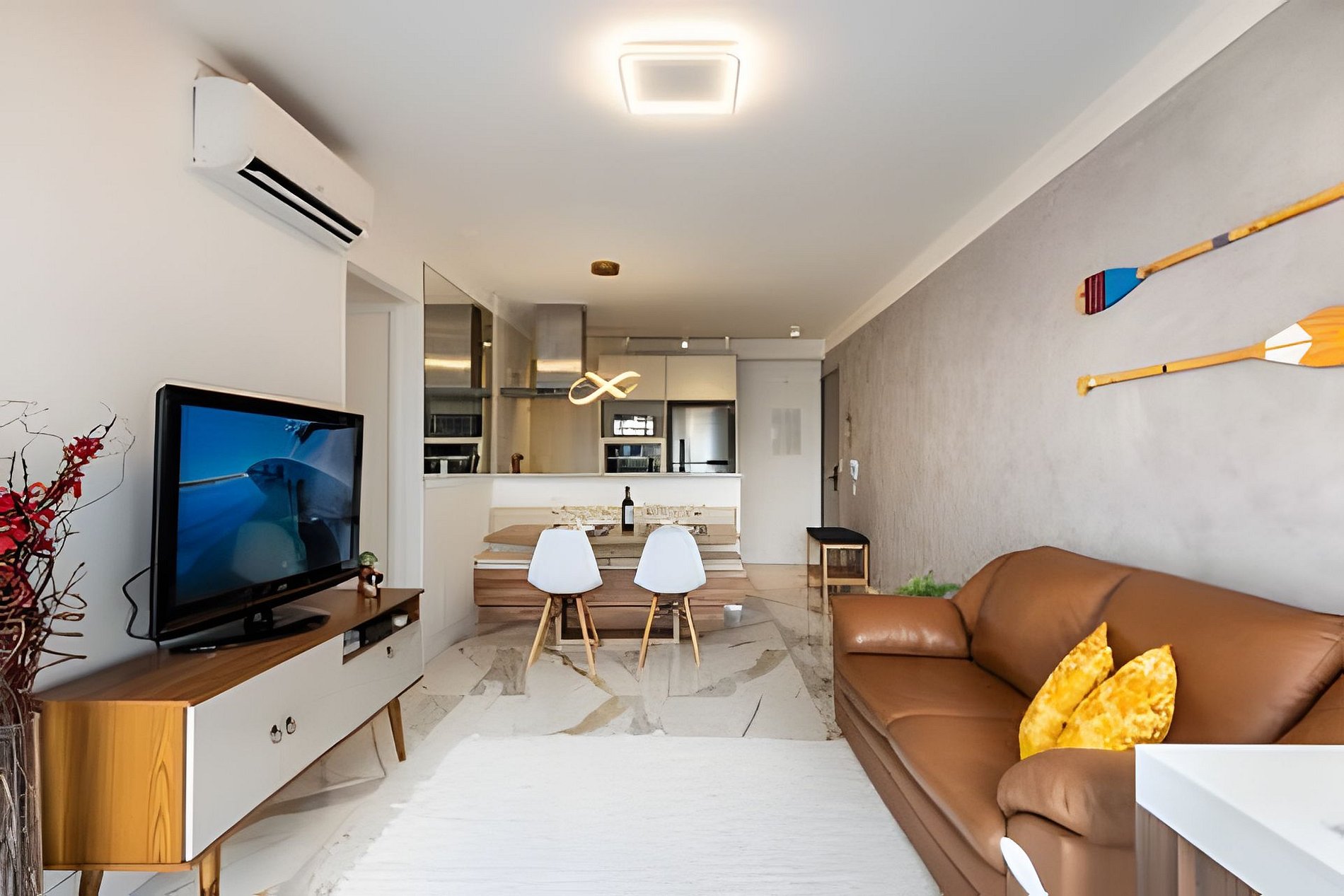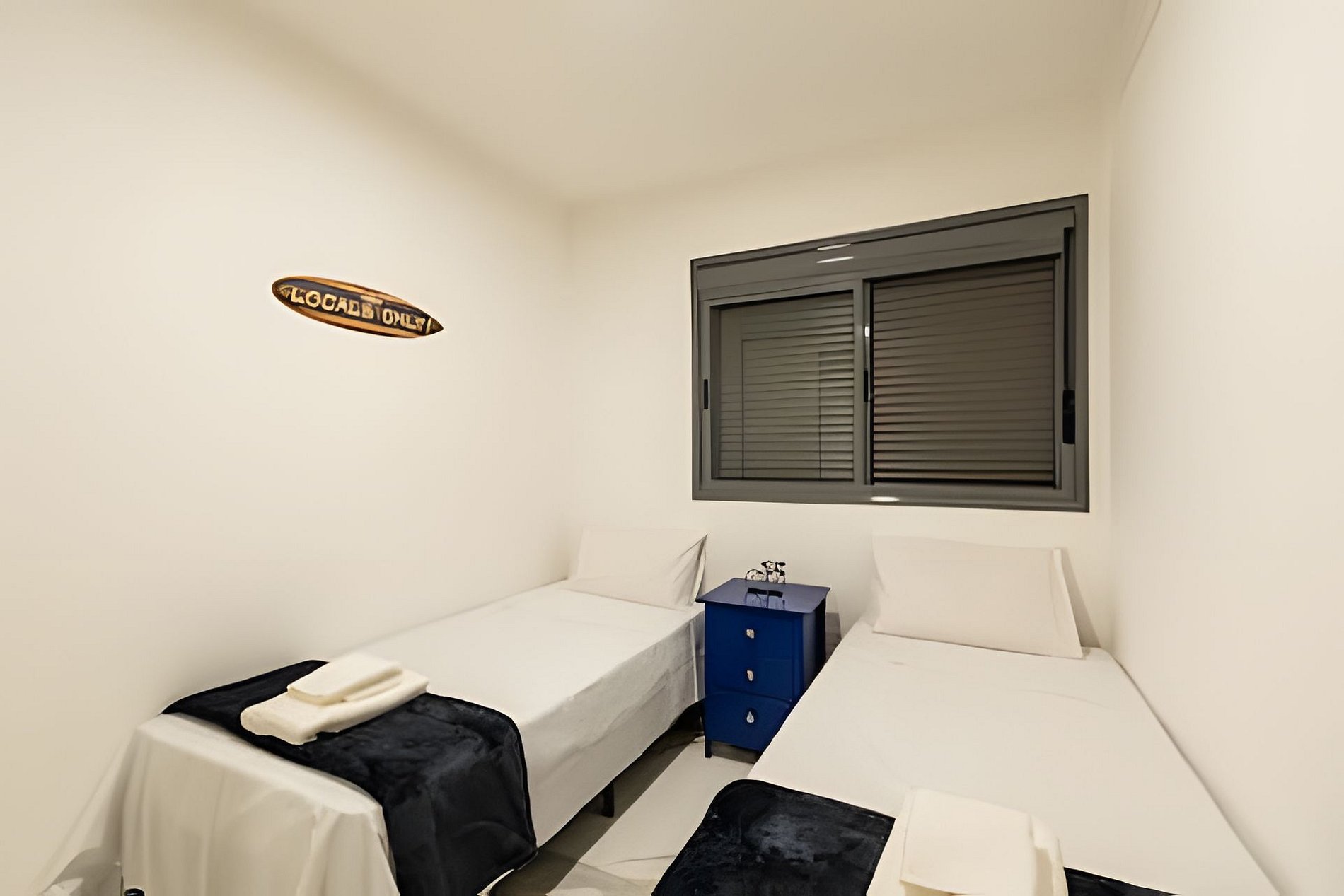 Apto com dois dormitórios, sendo 1 suíte. Suíte com cama casal, segundo quarto com 2 camas de solteiro. Cozinha completa com fogão de indução 4 bocas, forno elétrico, exaustor, geladeira com freezer, cafeteira elétrica Nespresso, além de utensílios de cozinha e panelas. Os banheiros possuem chuveiro de teto e água quente e fria. Ar condicionado na sala e na suíte.