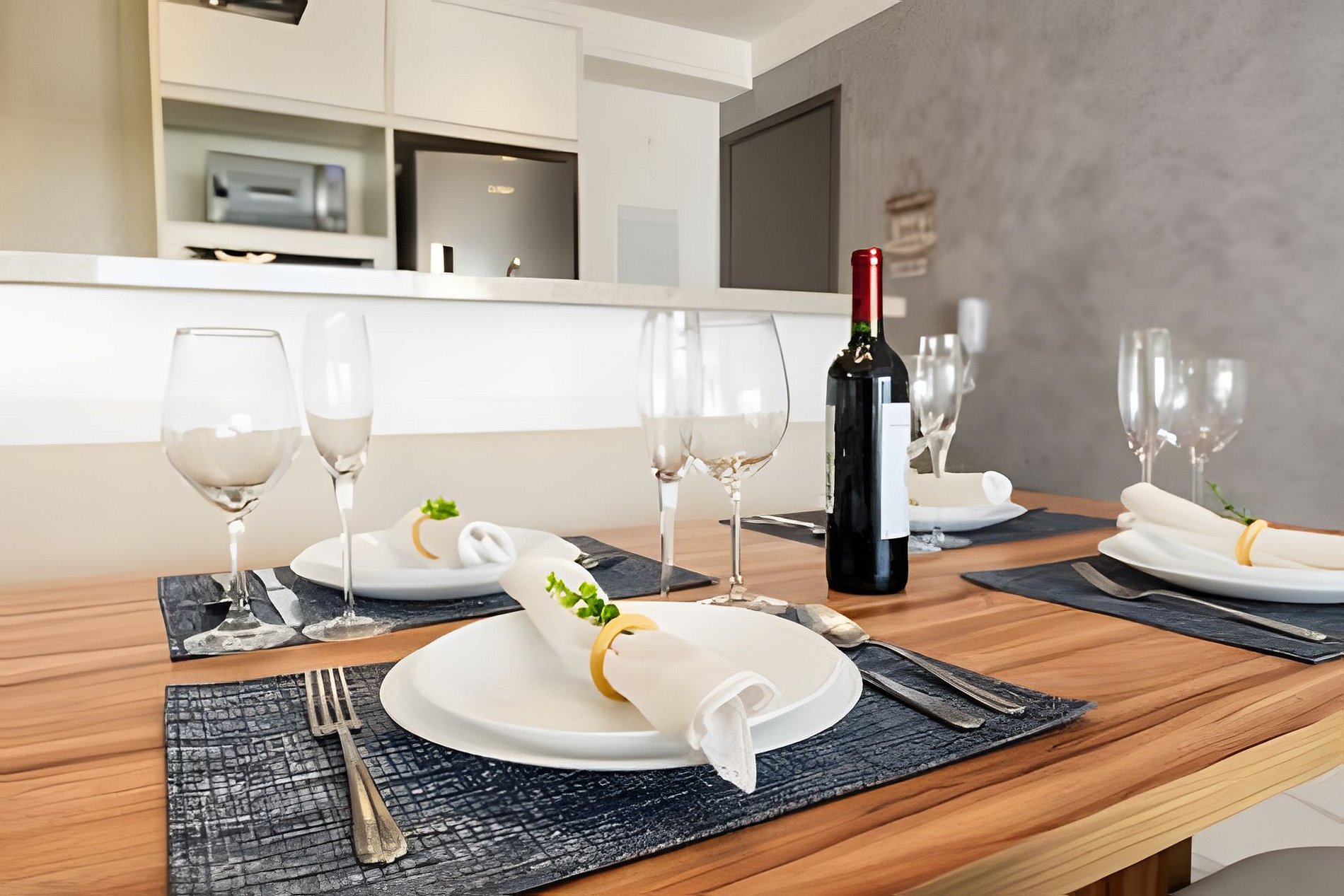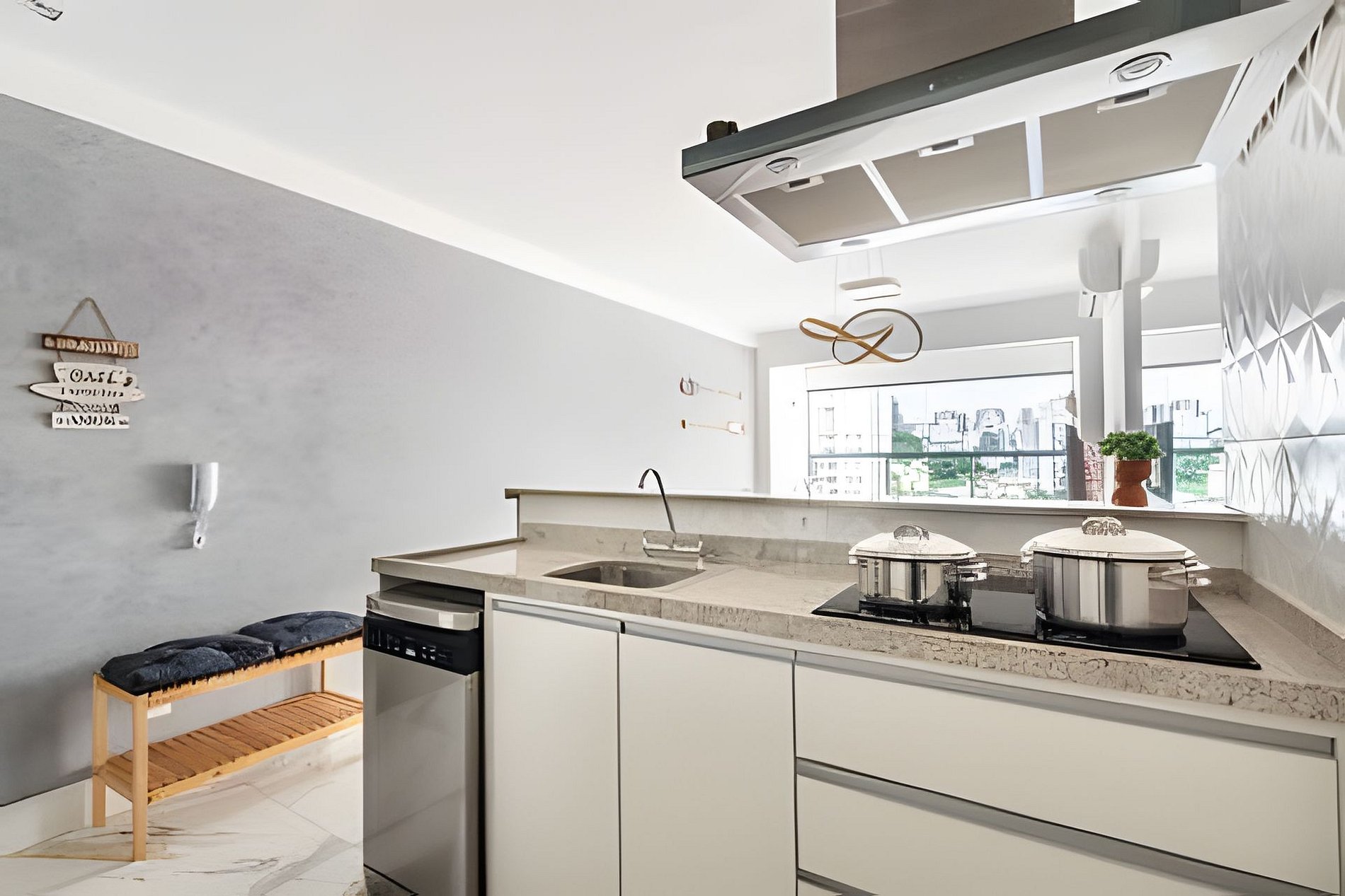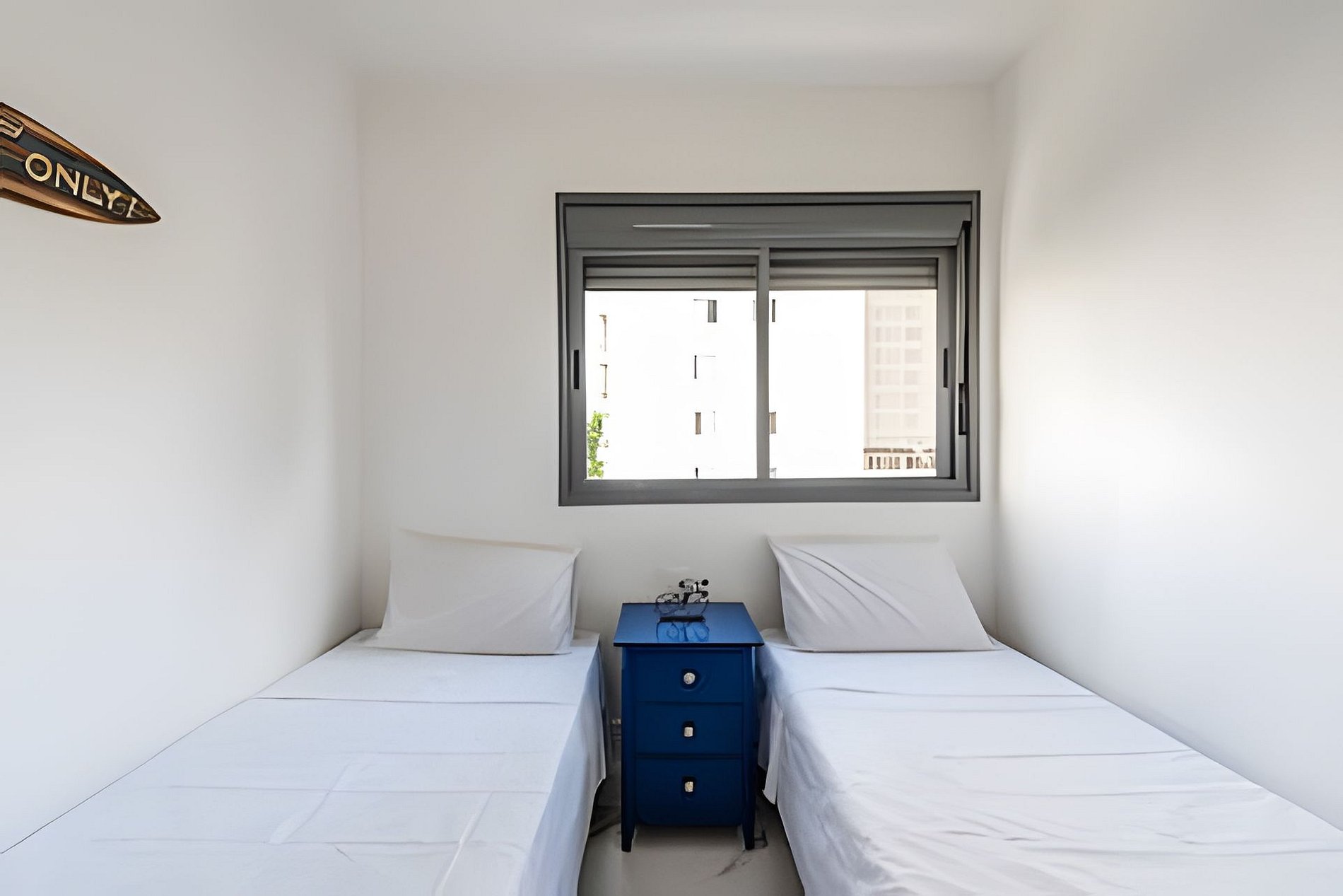 Apto com dois dormitórios, sendo 1 suíte. Suíte com cama casal, segundo quarto com 2 camas de solteiro. Cozinha completa com fogão de indução 4 bocas, forno elétrico, exaustor, geladeira com freezer, cafeteira elétrica Nespresso, além de utensílios de cozinha e panelas. Os banheiros possuem chuveiro de teto e água quente e fria. Ar condicionado na sala e na suíte.