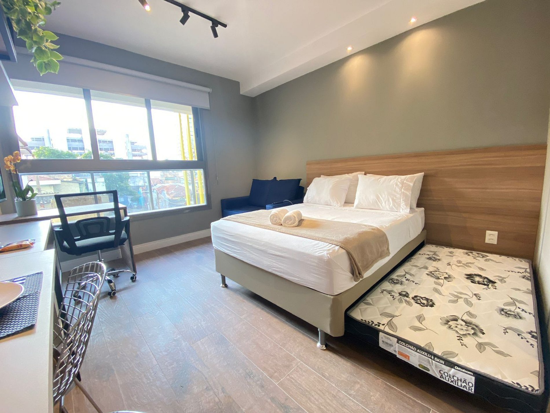 O Estúdio Cab possui janelas anti ruído e porta também com antirruído, está todo equipado, com uma cama confortável de casal e uma bicama de solteiro saindo do box da cama de casal, Smart TV 50", Wi-Fi de 250MB, Ar condicionado split, fogão cooktop de indução, forno elétrico, geladeira com freezer, micro-ondas, cafeteira térmica e coador de café , utensílios de cozinha com jogo de panelas, secador de cabelo, ferro de passar. Espaço para home office.