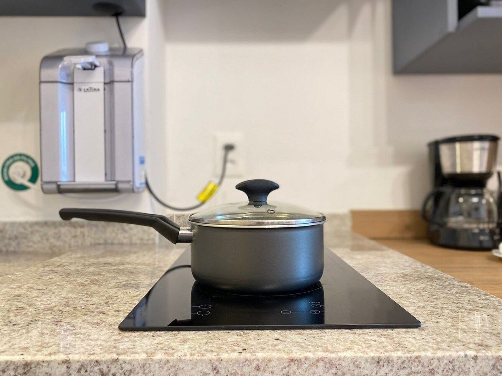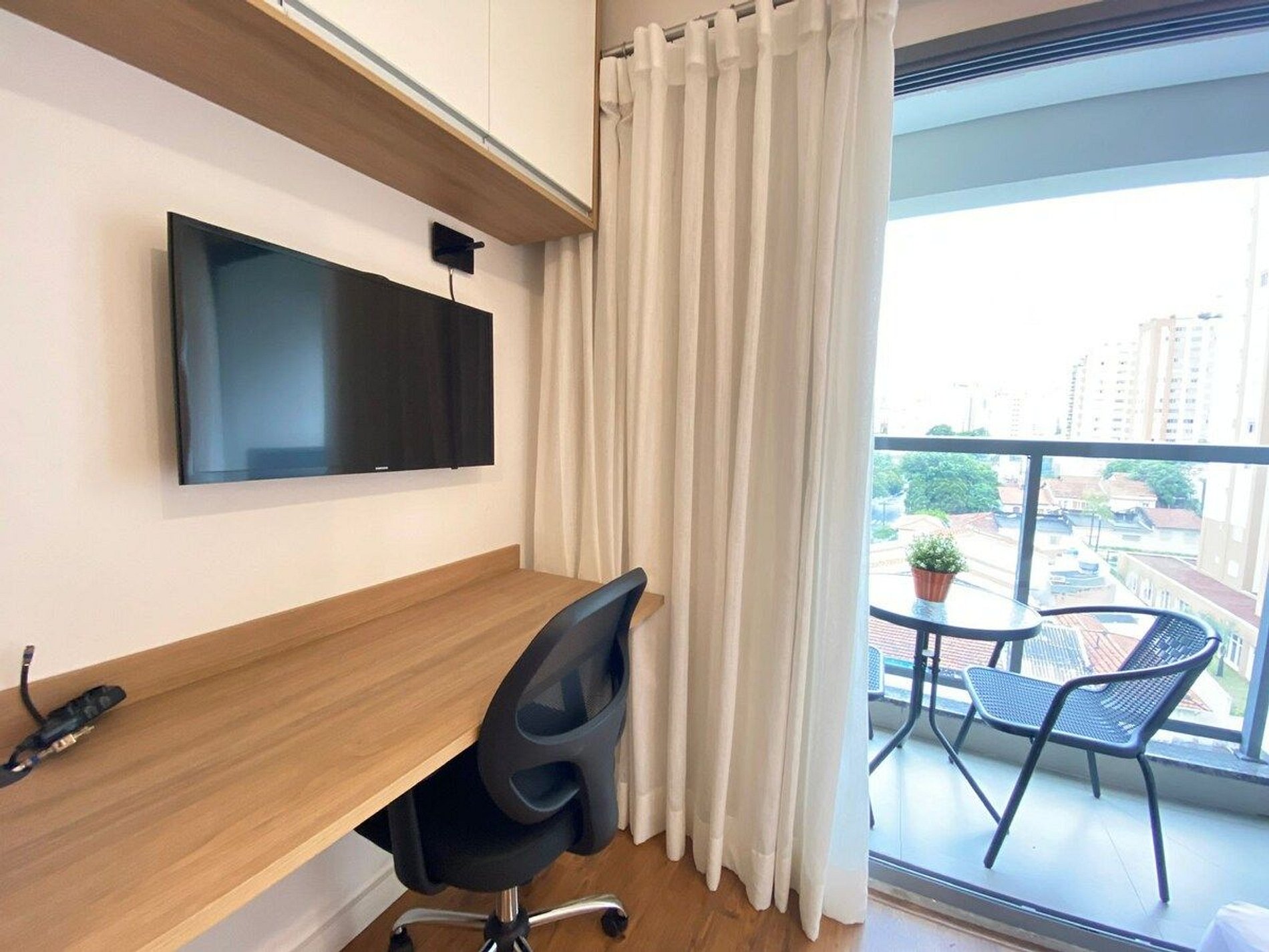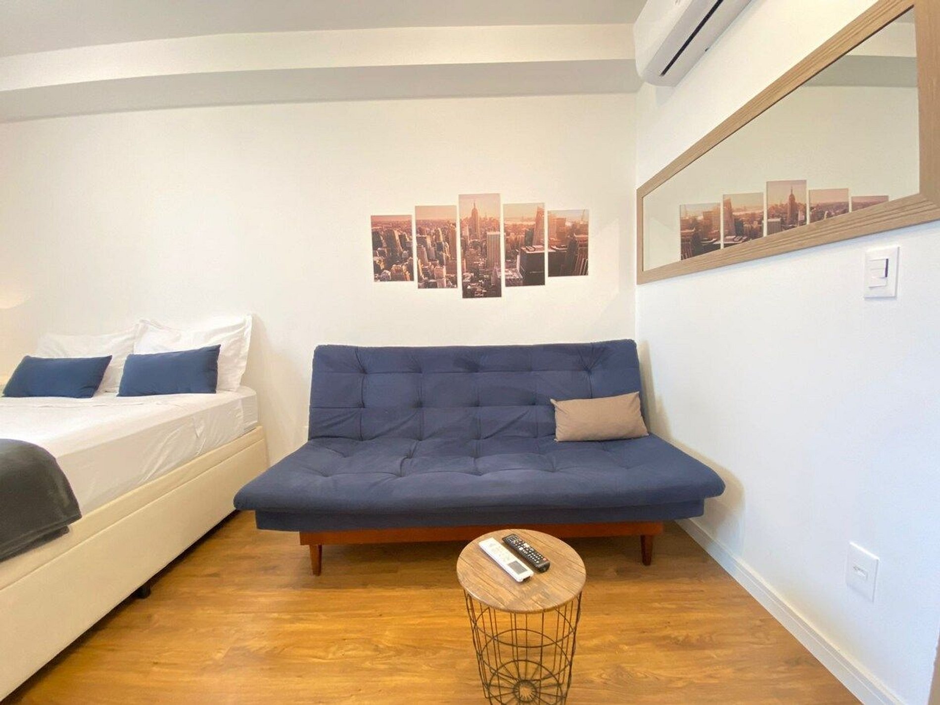 O Estúdio Cab está todo equipado, com uma cama confortável de casal, Smart TV, Wi-Fi de 250MB, Ar condicionado split, fogão cooktop de indução, forno elétrico, geladeira com freezer, micro-ondas, cafeteria elétrica, filtro de água, liquidificador, utensílios de cozinha com jogo de panelas, secador de cabelo, ferro e tábua de passar. Espaço para home office.