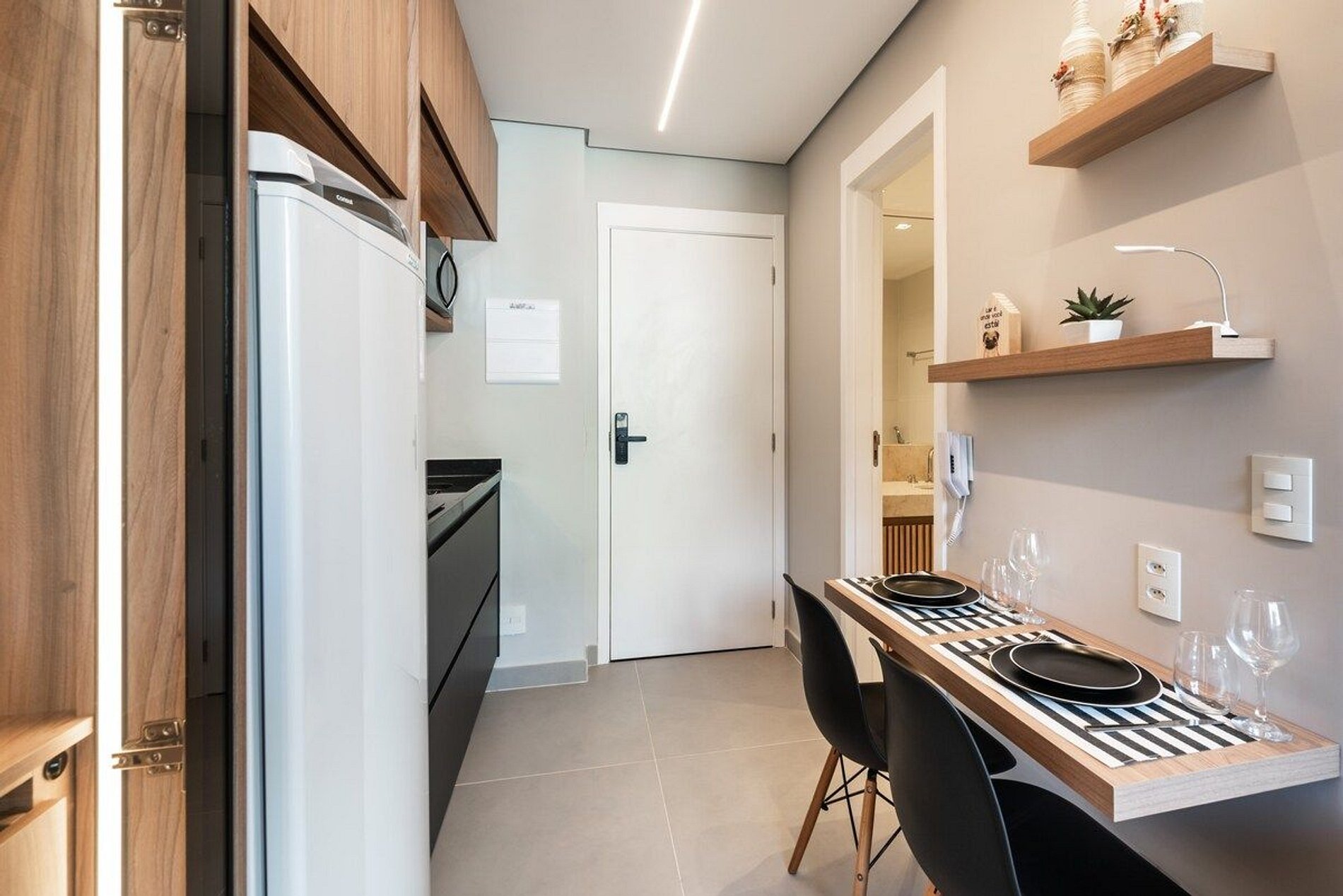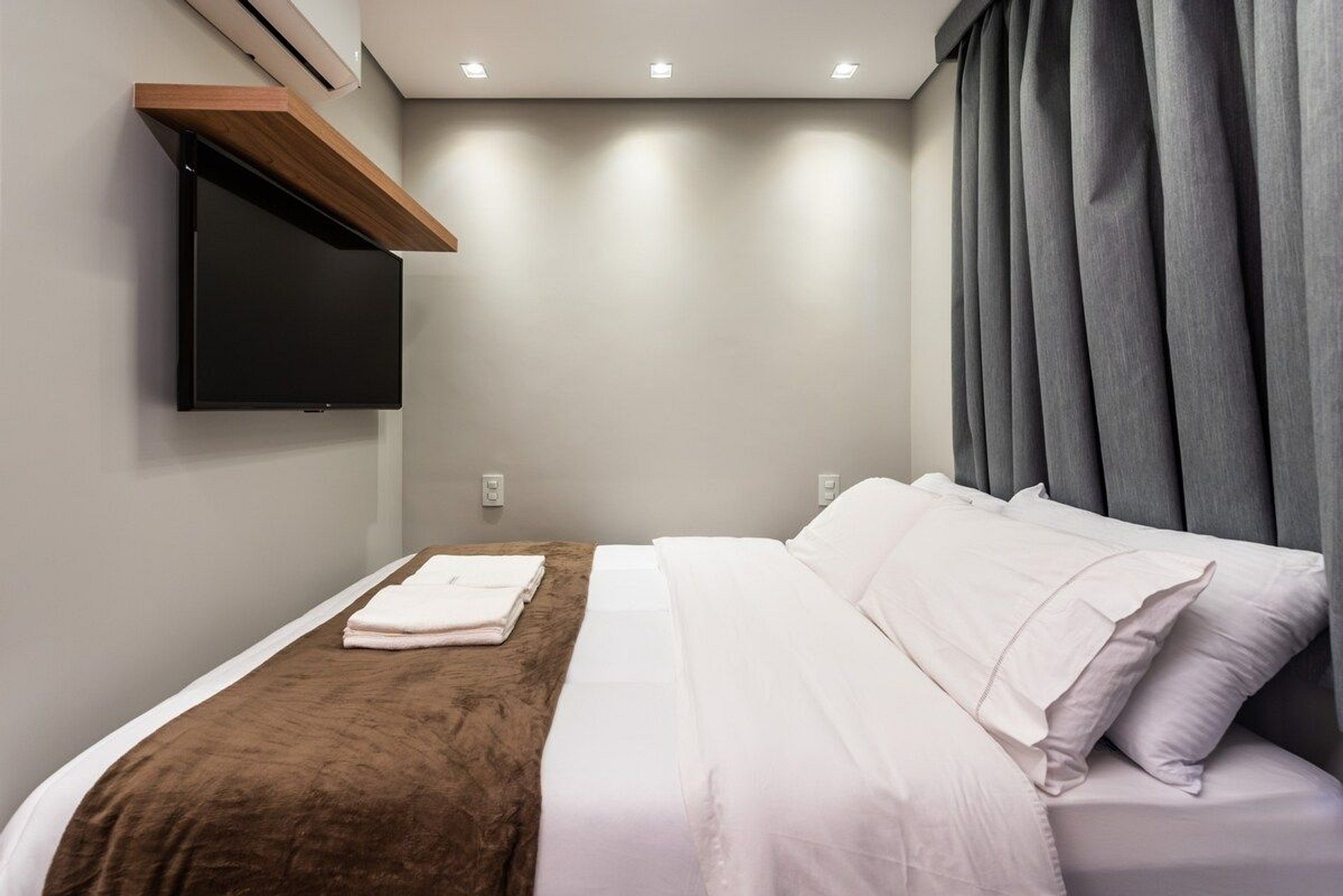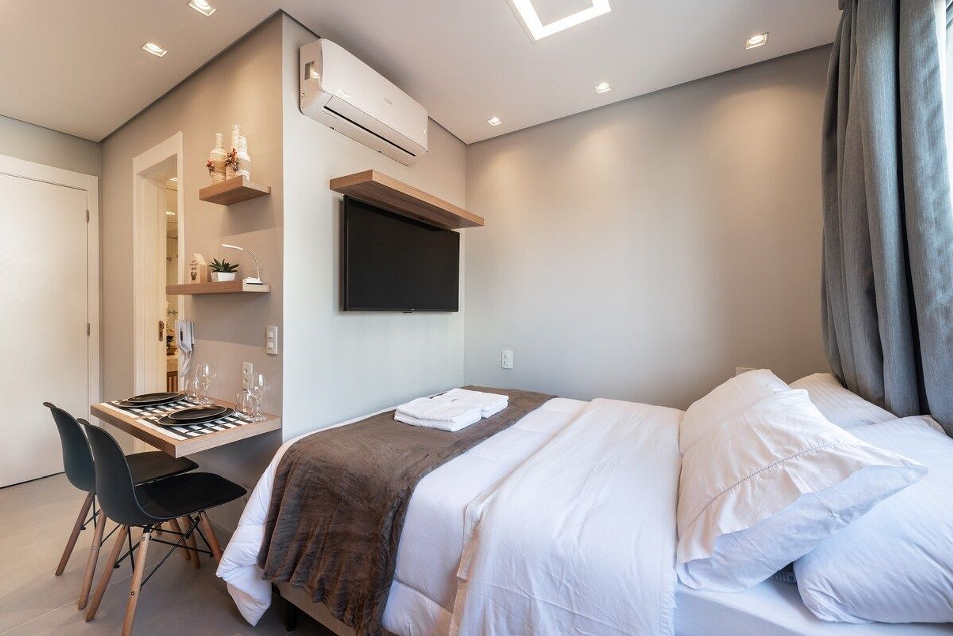 O apartamento conta com uma cama de casal padrão com colchão de alta qualidade. Equipado com Wi-Fi, Smart TV (sem canais a cabo), cooktop, geladeira, micro-ondas, torradeira, liquidificador, cafeteria elétrica, ar condicionado split, secador de cabelo, ferro e tábua de passar.