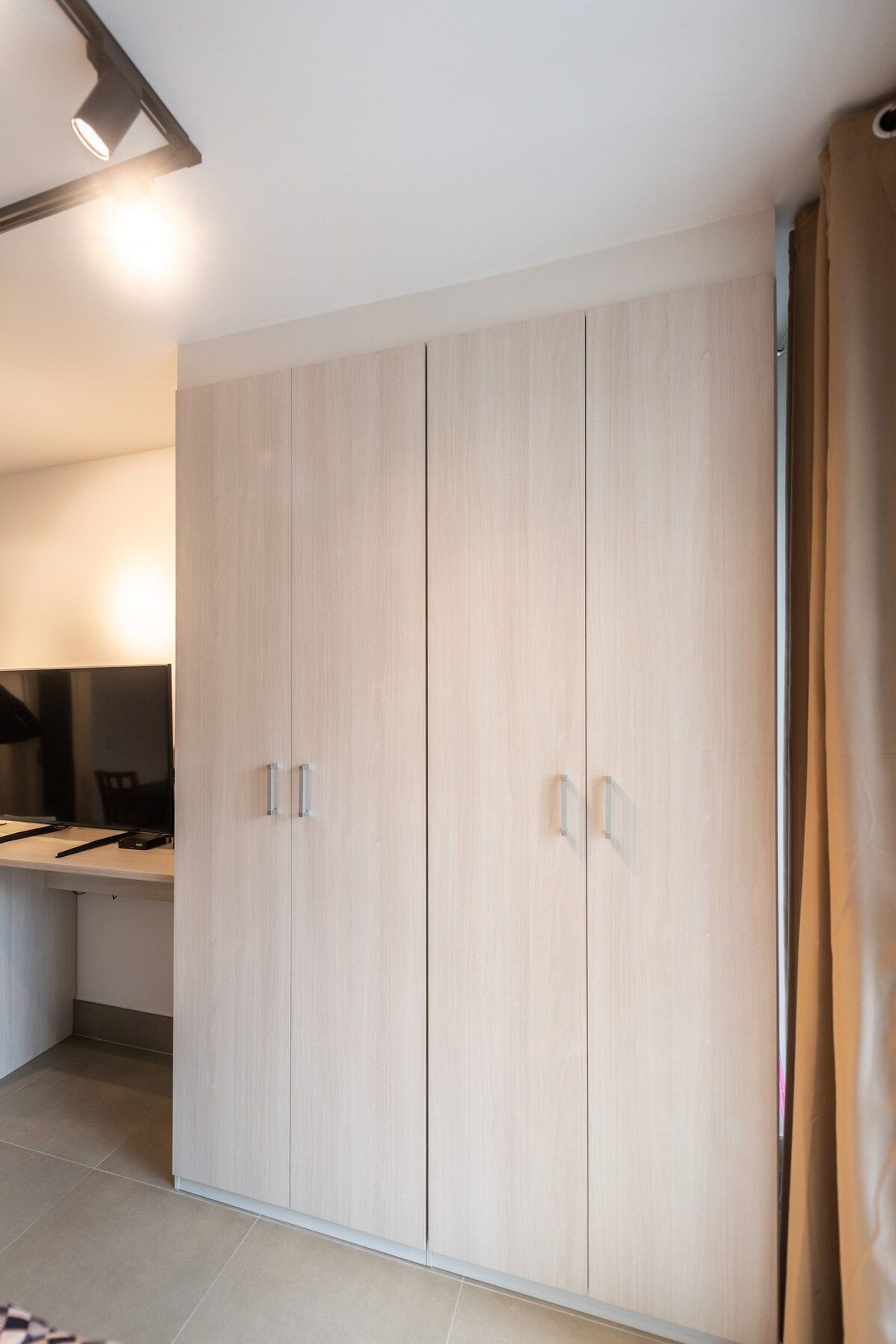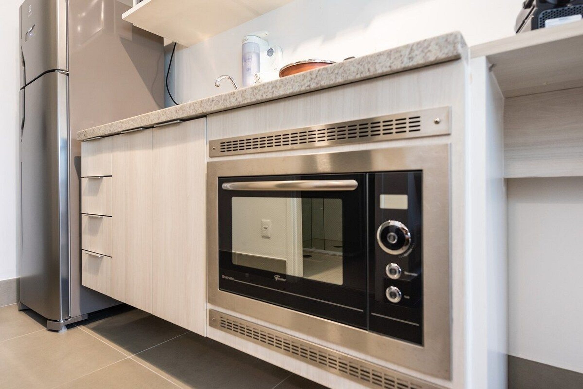 O Studio de 26m², possui uma cama de casal, um sofázinho, mesa de jantar para 2 pessoas, cozinha completa com fogão de indução (2 bocas), forno, filtro de água, geladeira com freezer, cafeteira Nespresso, chaleira elétrica, ferro de passar roupa, secador, guarda-roupa com cabides e 4 travesseiros.
