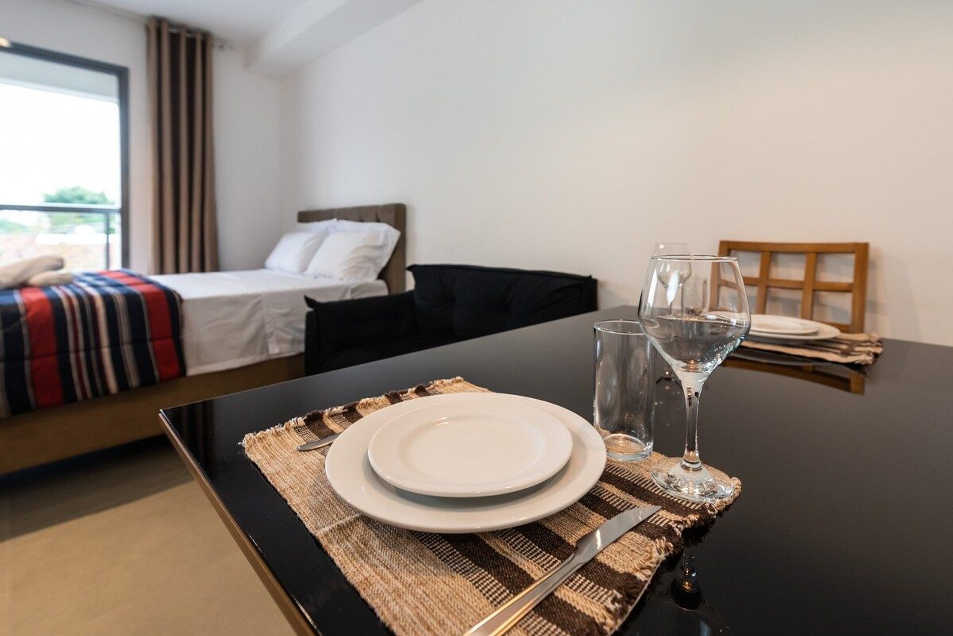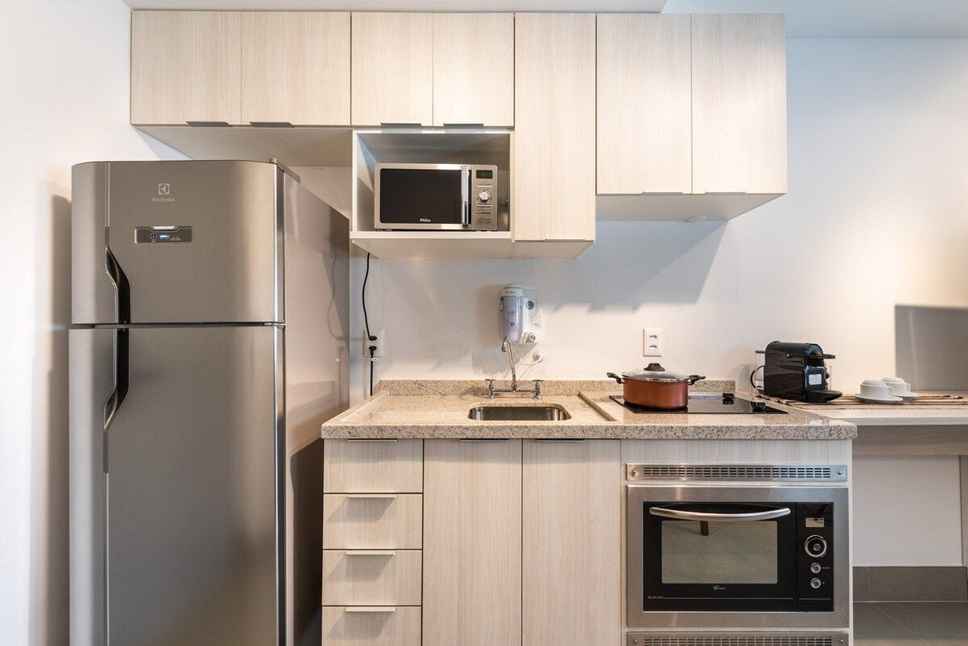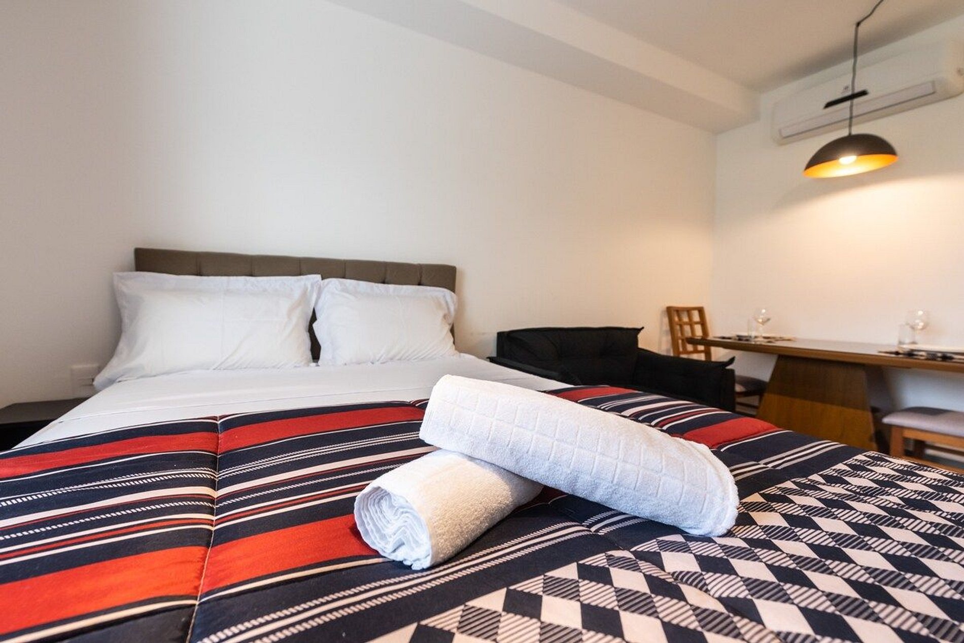 O Studio de 26m², possui uma cama de casal, um sofázinho, mesa de jantar para 2 pessoas, cozinha completa com fogão de indução (2 bocas), forno, filtro de água, geladeira com freezer, cafeteira Nespresso, chaleira elétrica, ferro de passar roupa, secador, guarda-roupa com cabides e 4 travesseiros.