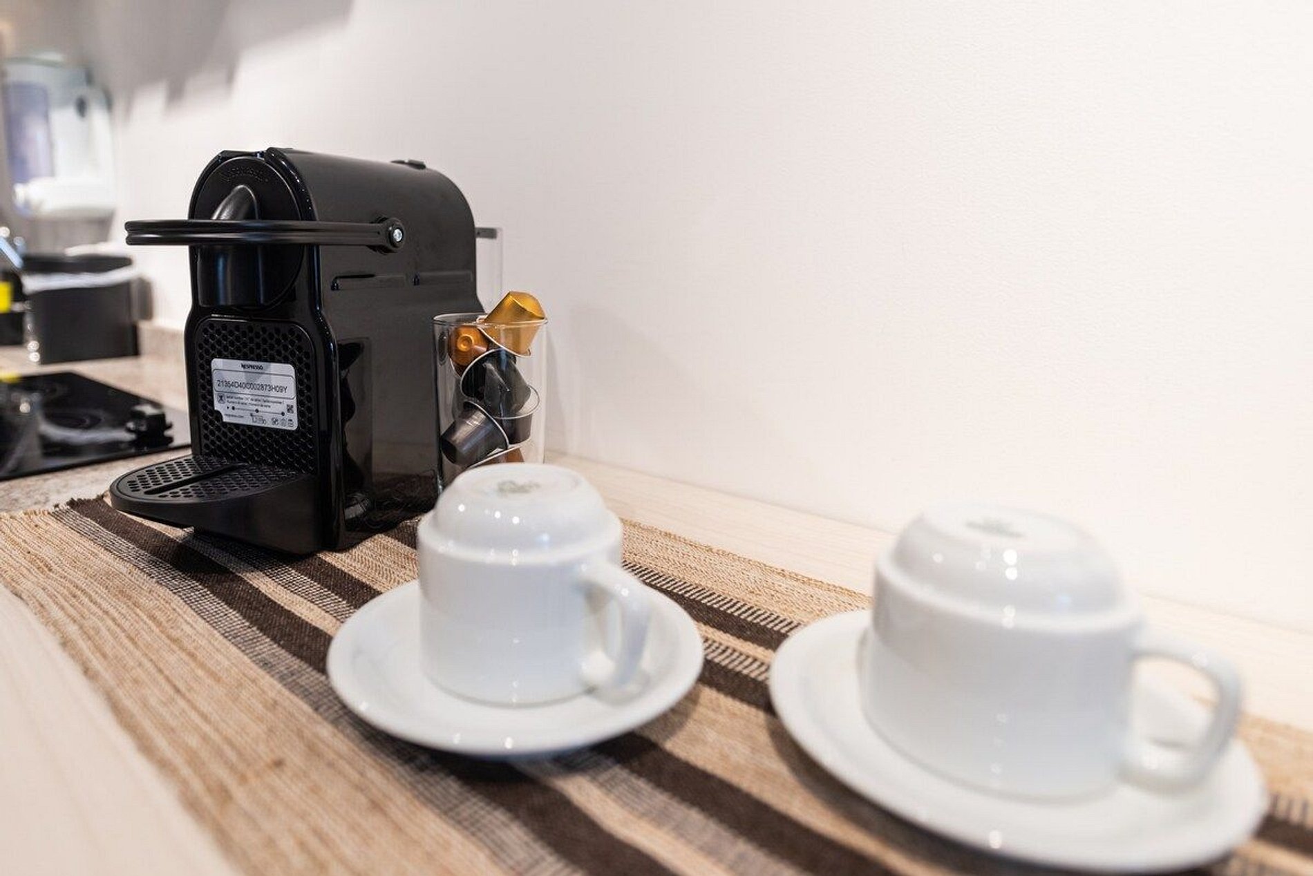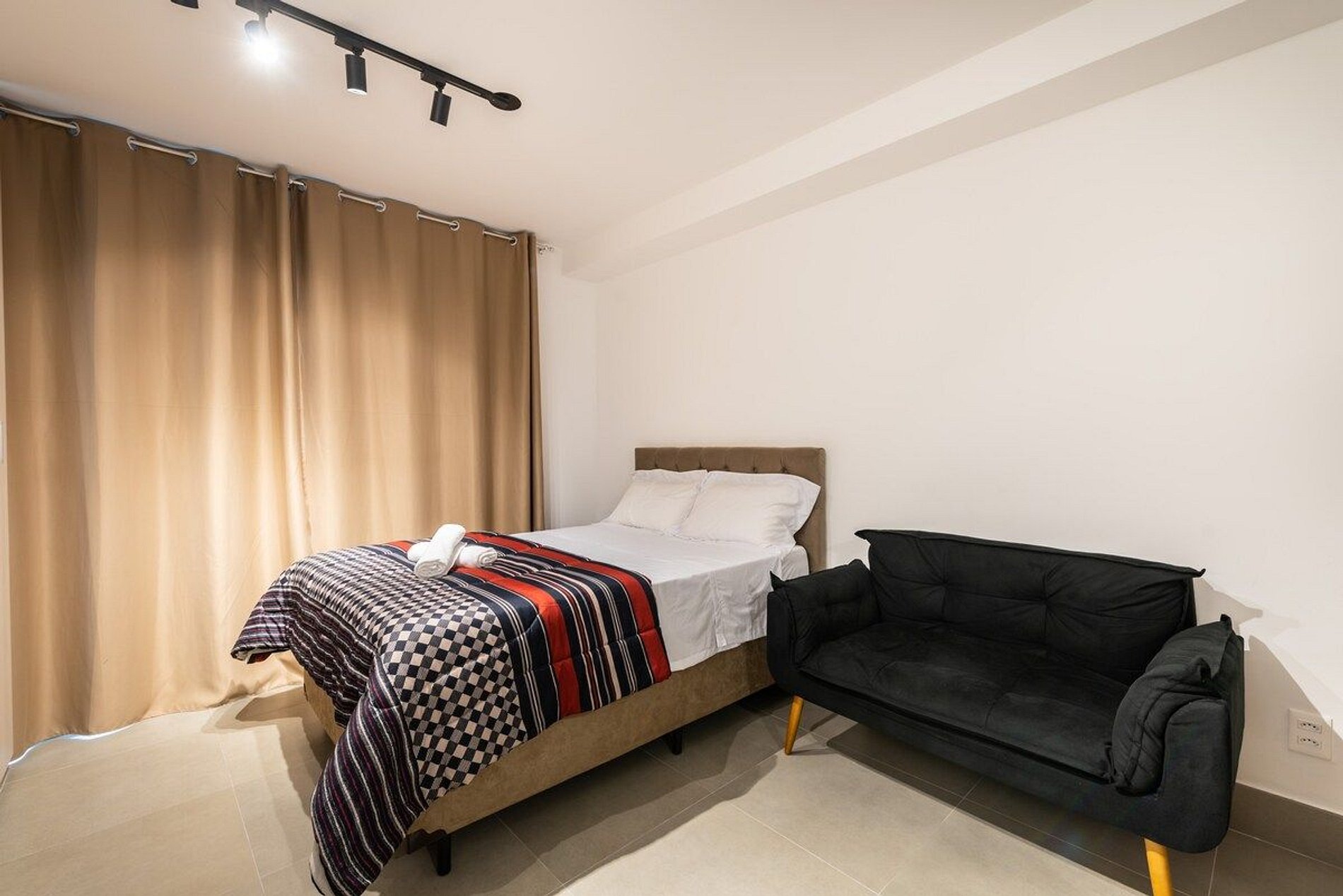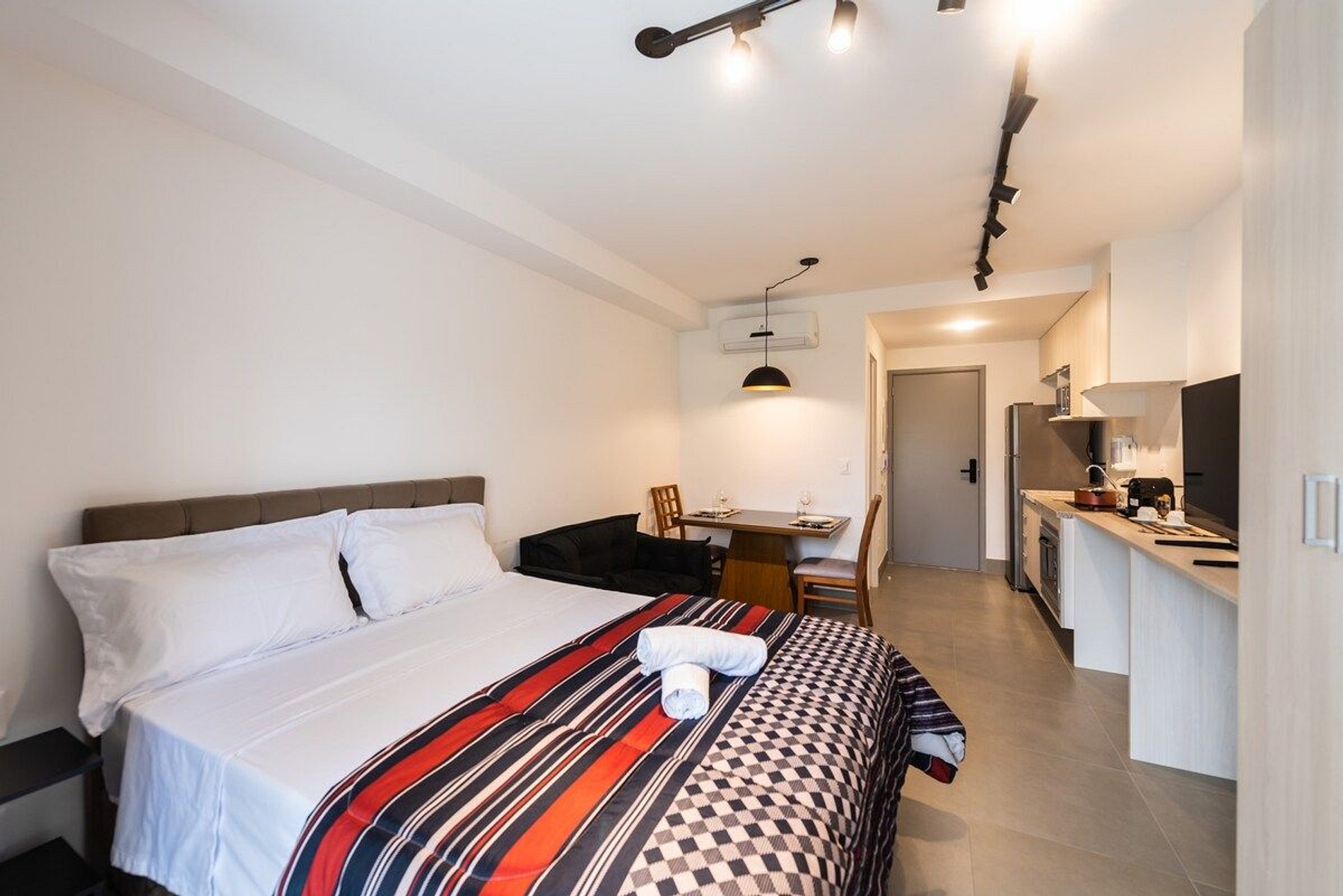 O Studio de 26m², possui uma cama de casal, um sofázinho, mesa de jantar para 2 pessoas, cozinha completa com fogão de indução (2 bocas), forno, filtro de água, geladeira com freezer, cafeteira Nespresso, chaleira elétrica, ferro de passar roupa, secador, guarda-roupa com cabides e 4 travesseiros.