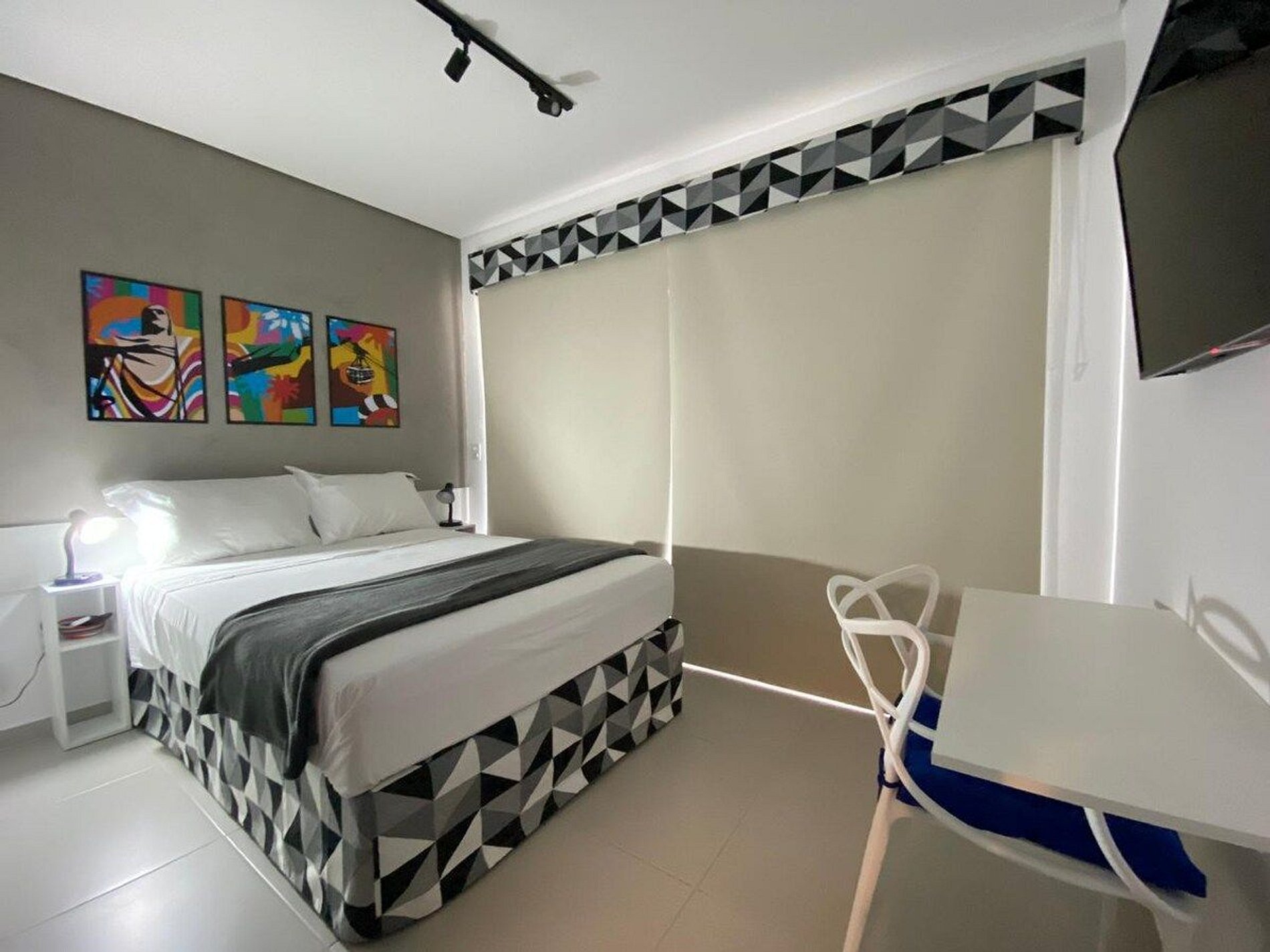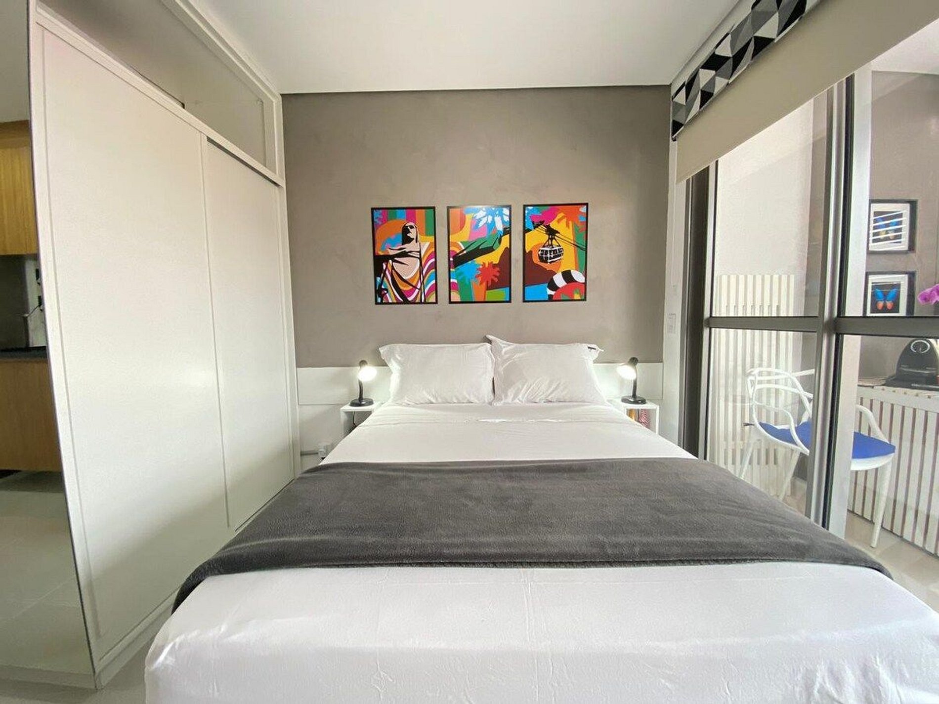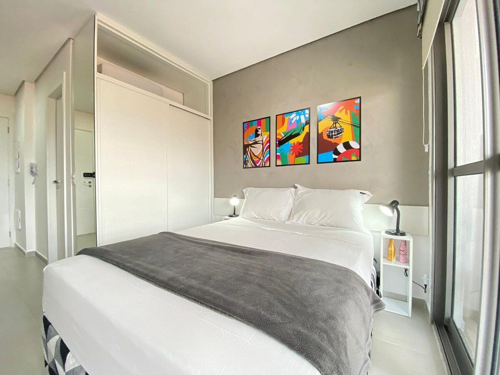O apartamento conta com uma cama de casal padrão (1,38x1,88). Equipado com Wi-Fi, Smart TV (sem canais a cabo), cooktop, airfryer, geladeira, micro-ondas, ar condicionado, secador de cabelo, utensílios de cozinha, guarda-roupa, mesa para trabalho e blackout nas cortinas.