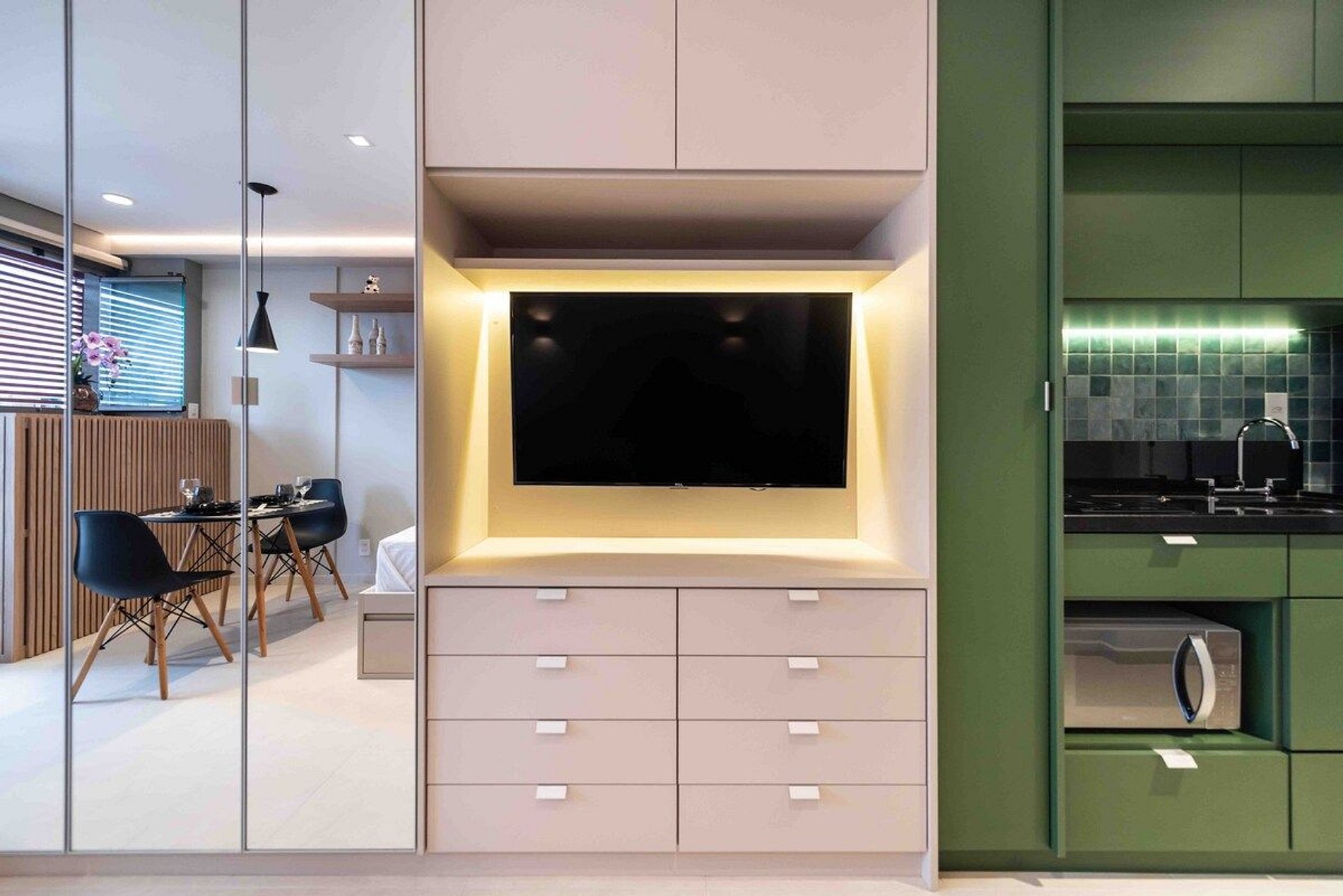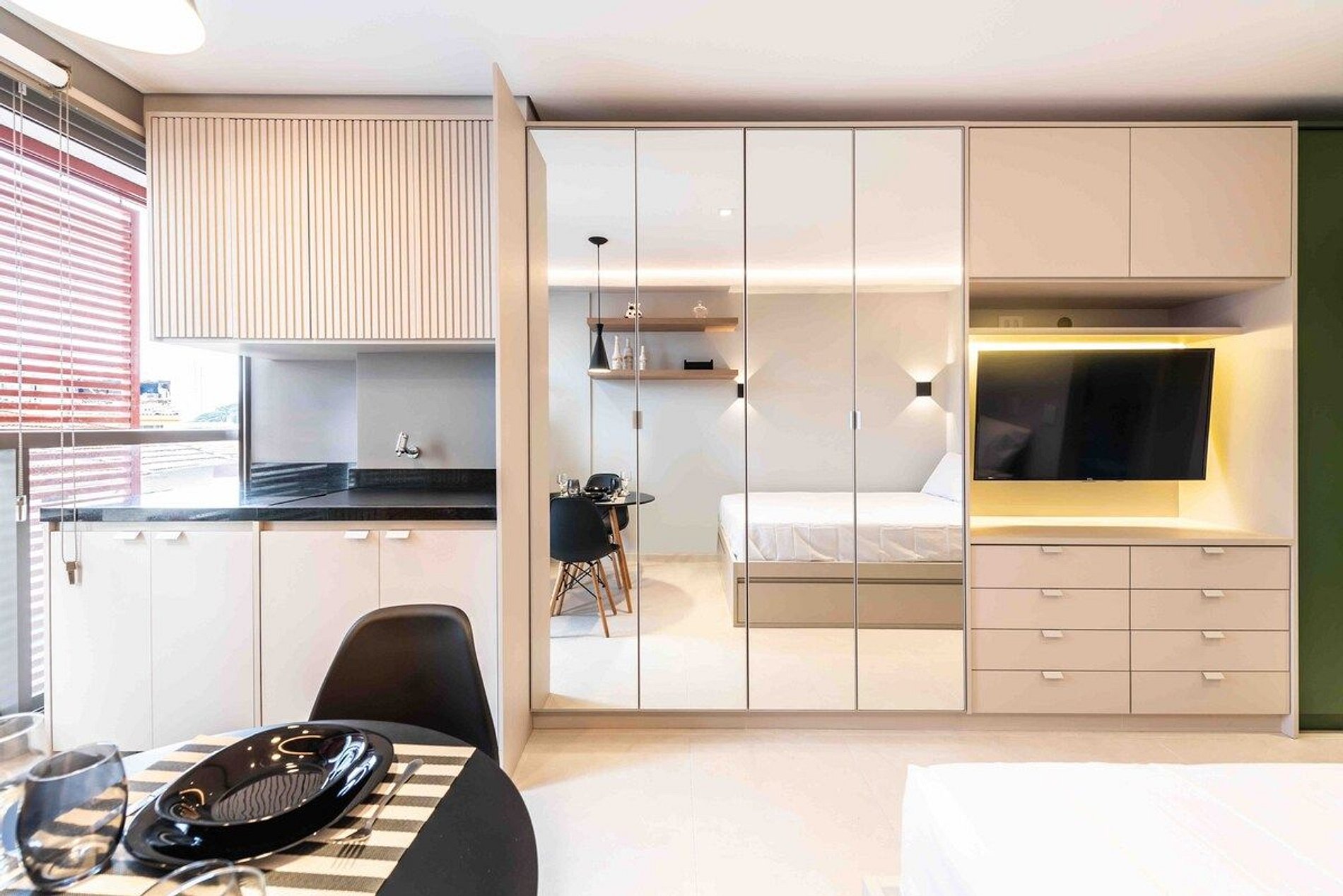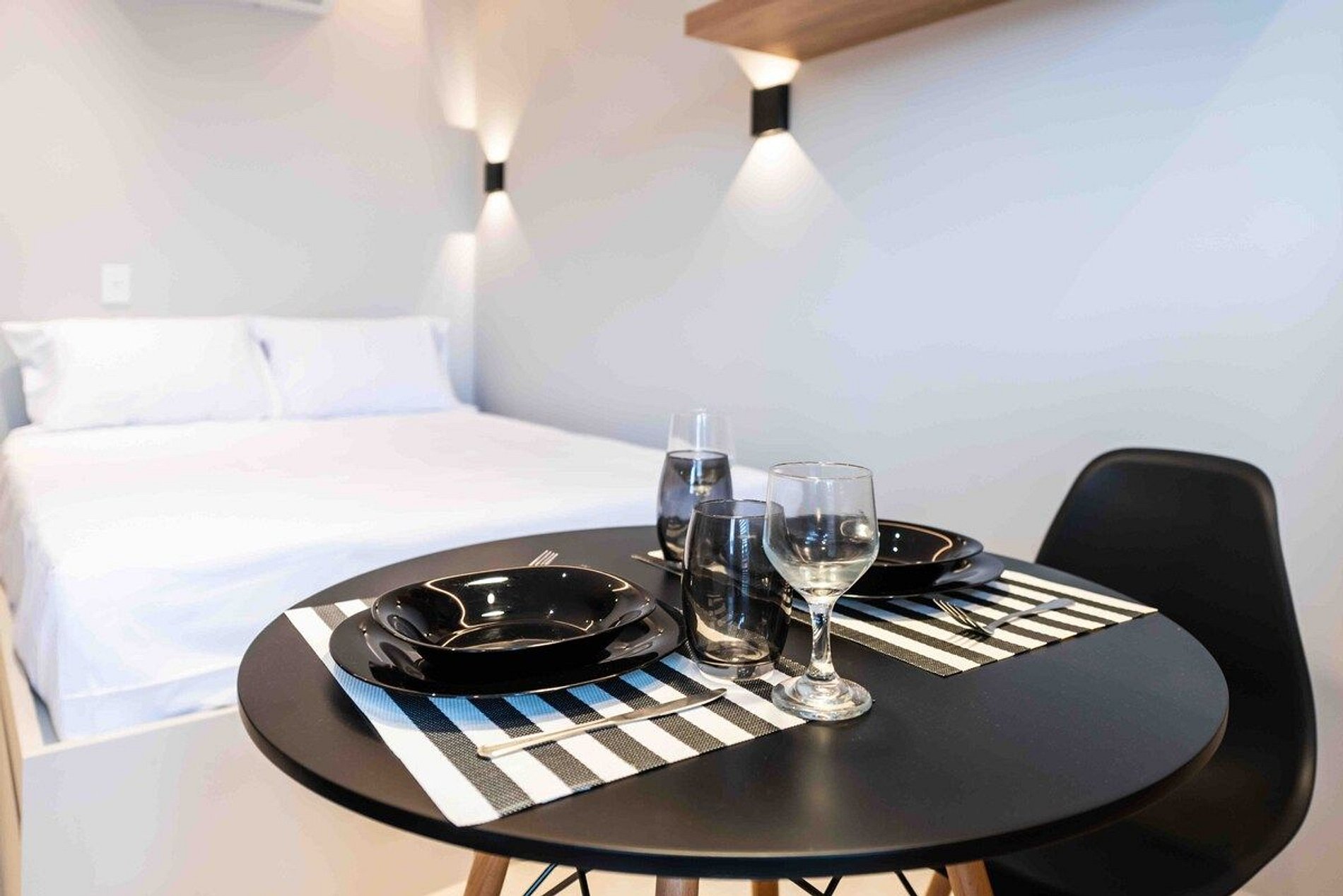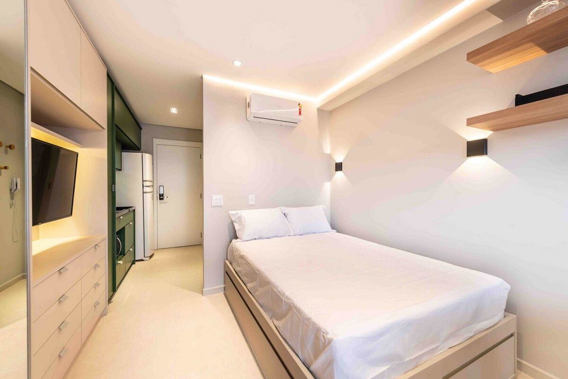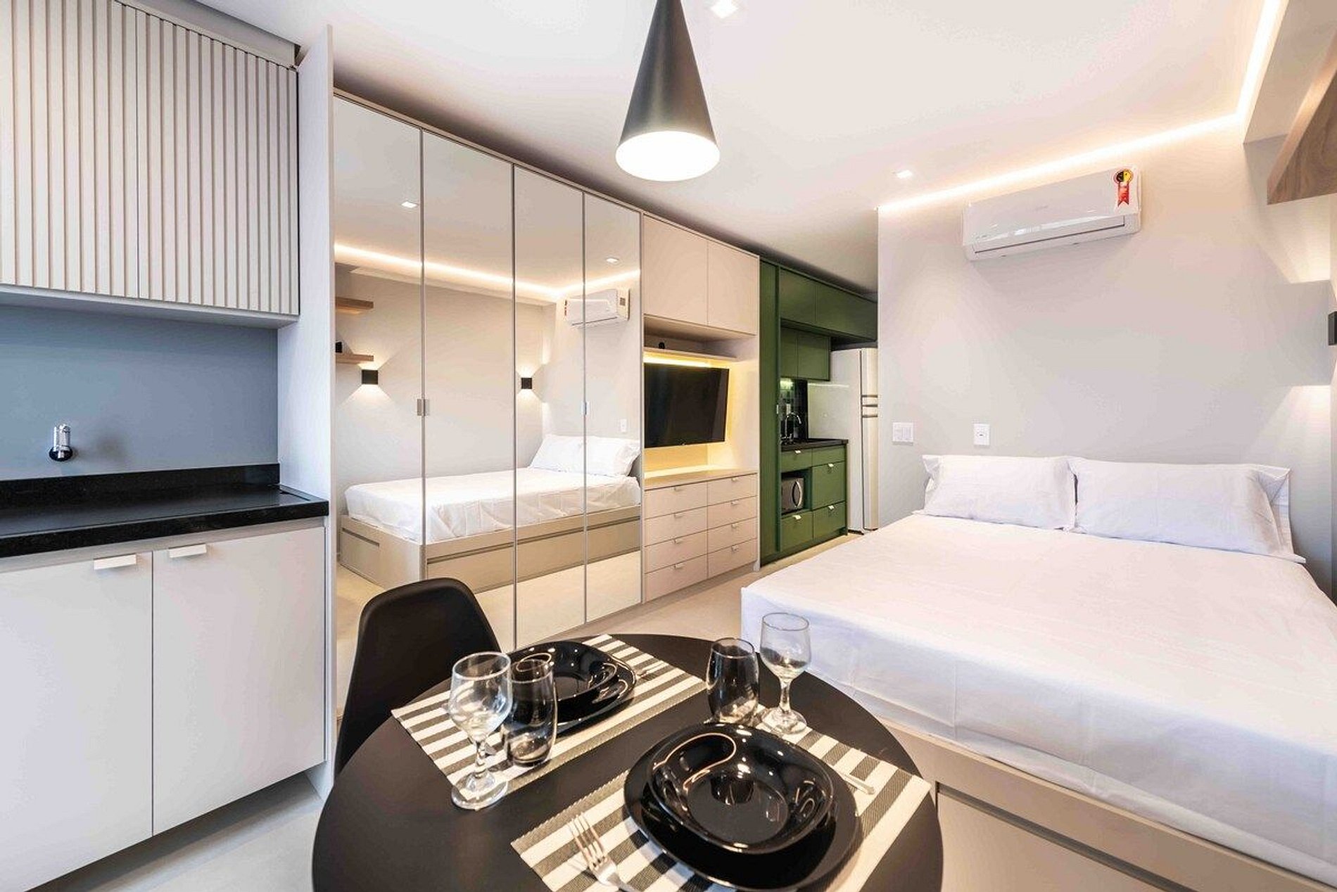 O apartamento conta com uma cama de casal padrão (1,38x1,88). Equipado com Wi-Fi, Smart TV (sem canais a cabo), cooktop, cafeteira eletrica, geladeira, micro-ondas, ar condicionado, secador de cabelo, utensílios de cozinha, guarda-roupa, ferro de passar roupa e blackout nas cortinas.