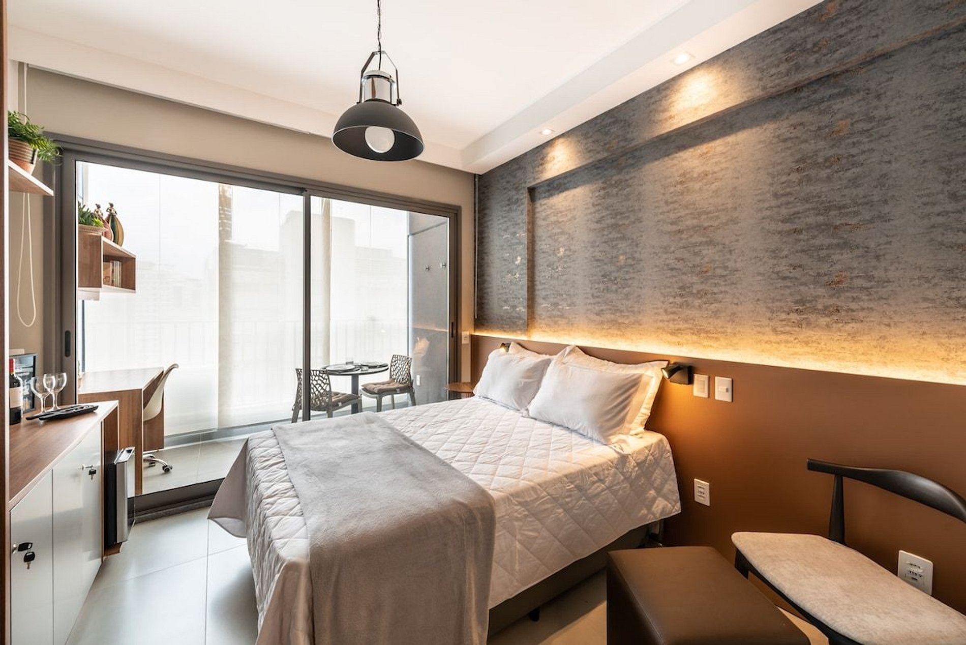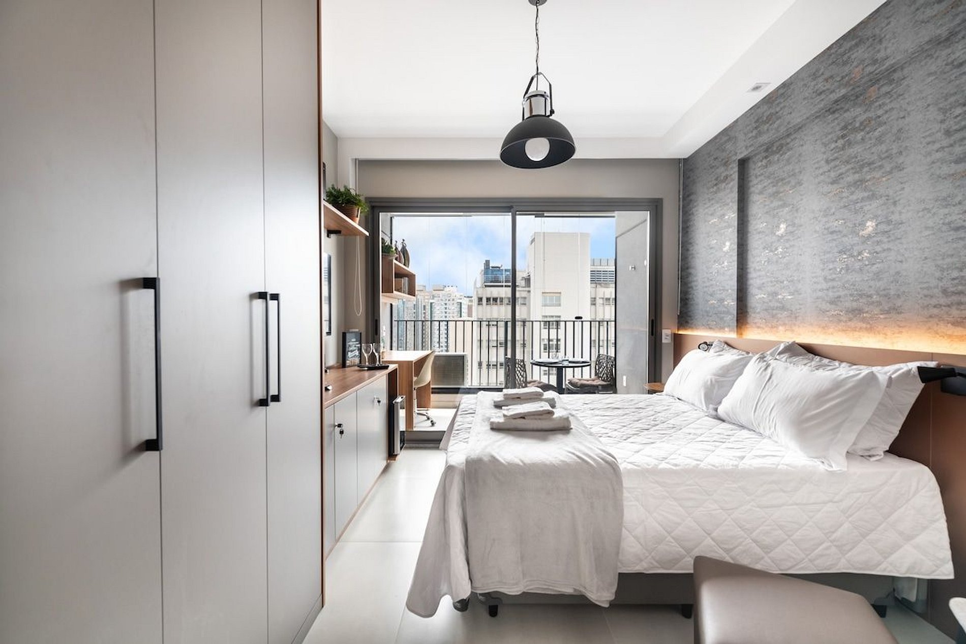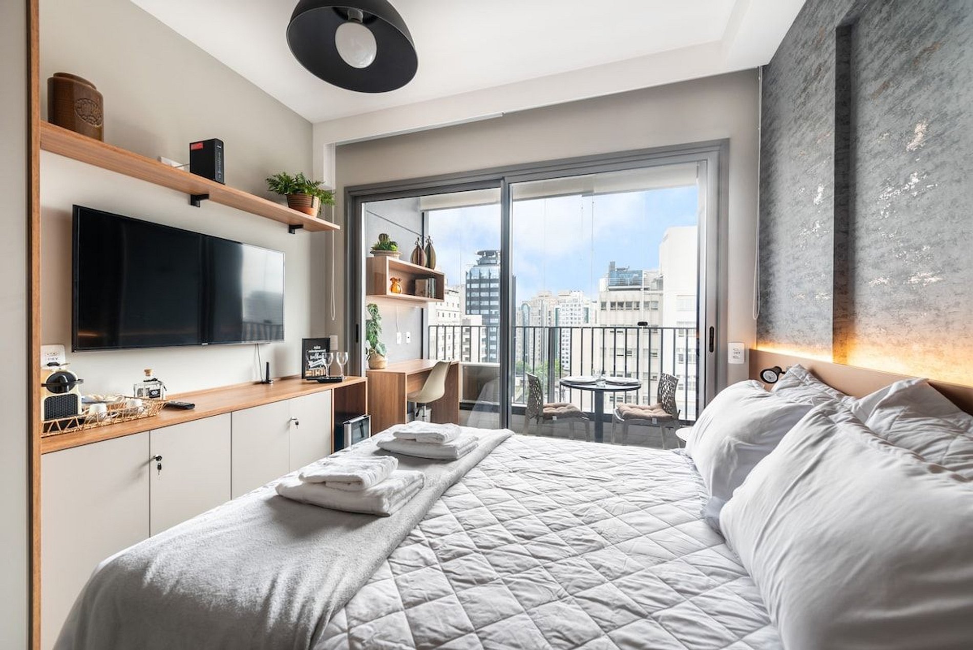 O nosso espaço é completo, você terá a sua disposição uma cama de casal padrão com uma bicama auxiliar saindo do box de casal. O studio possui wifi, TV smart, cafeteira elétrica em pó, cafeteira nespresso, liquidificador, sanduicheira, chaleira elétrica, secador de cabelo, chapinha, mesa de trabalho, adega, taças de vinho, abridor, talheres, pratos e utensílios de cozinha completo. Será fornecido um jogo de enxoval (lençóis, travesseiros, fronhas e toalhas de banho e rosto) para os dois hóspedes. Não há trocas durante a permanência. Também é possível deixar um kit de enxovais extra com o pagamento de uma taxa adicional. Você consegue encontrar tudo que precisa com facilidade indo a pé.