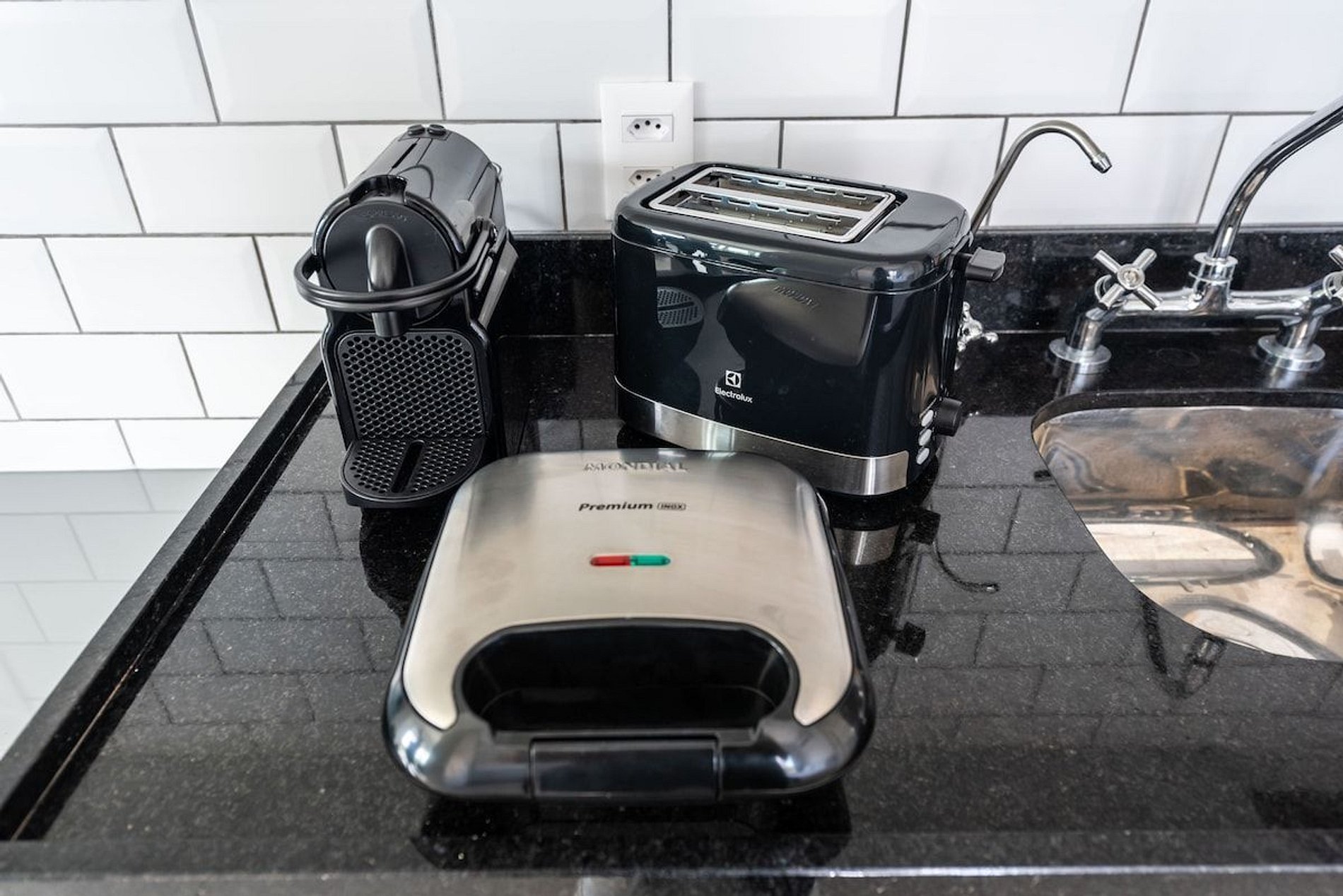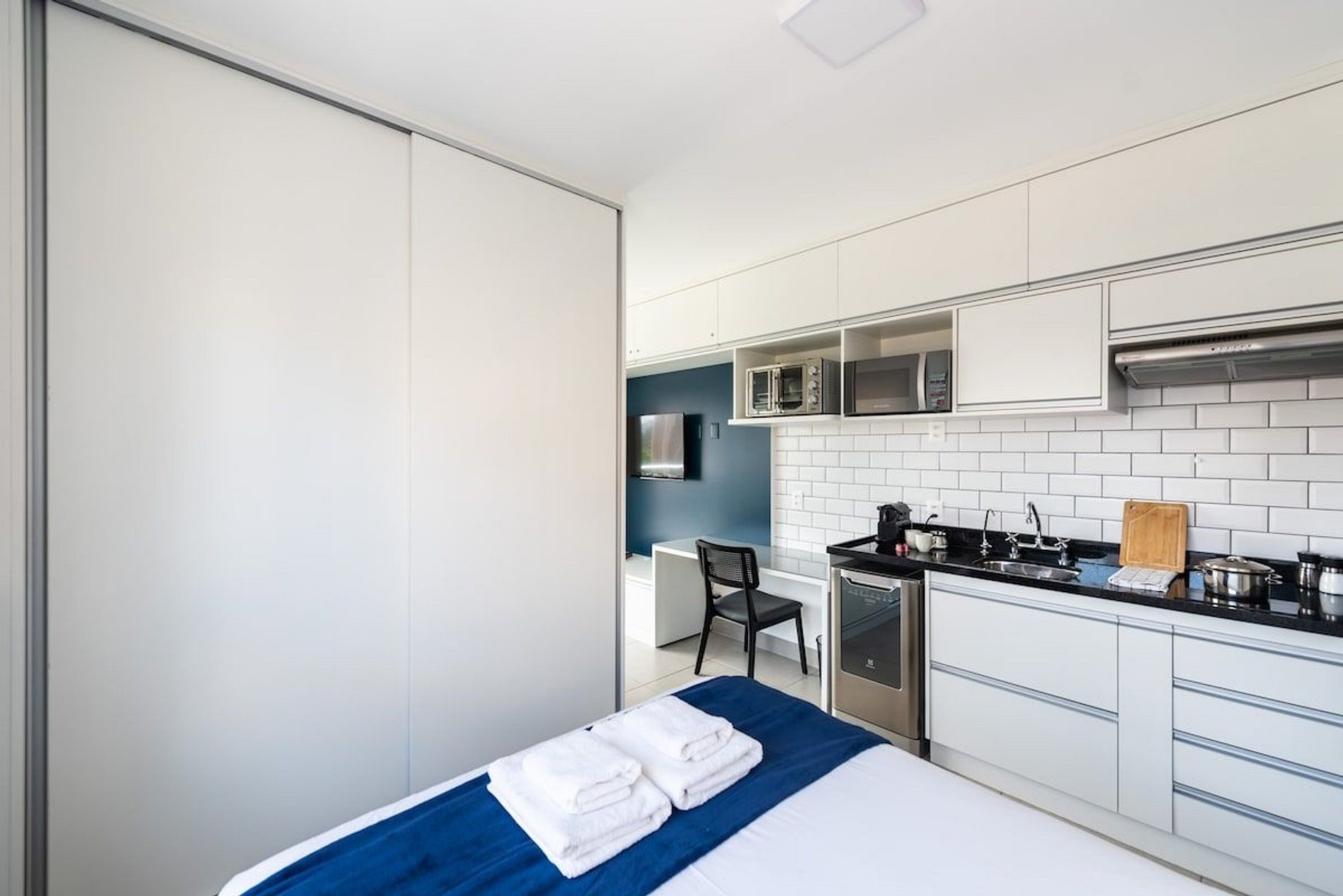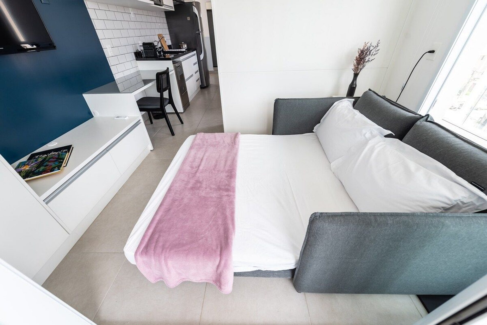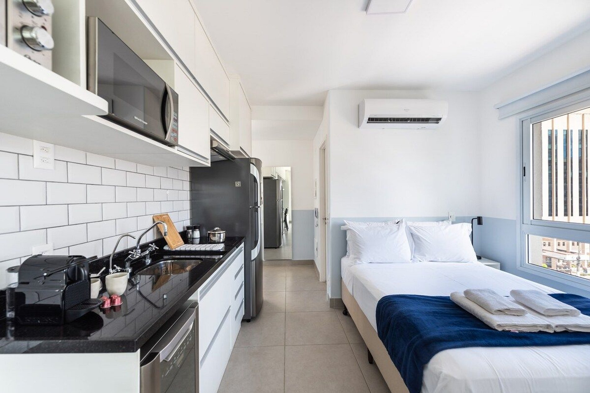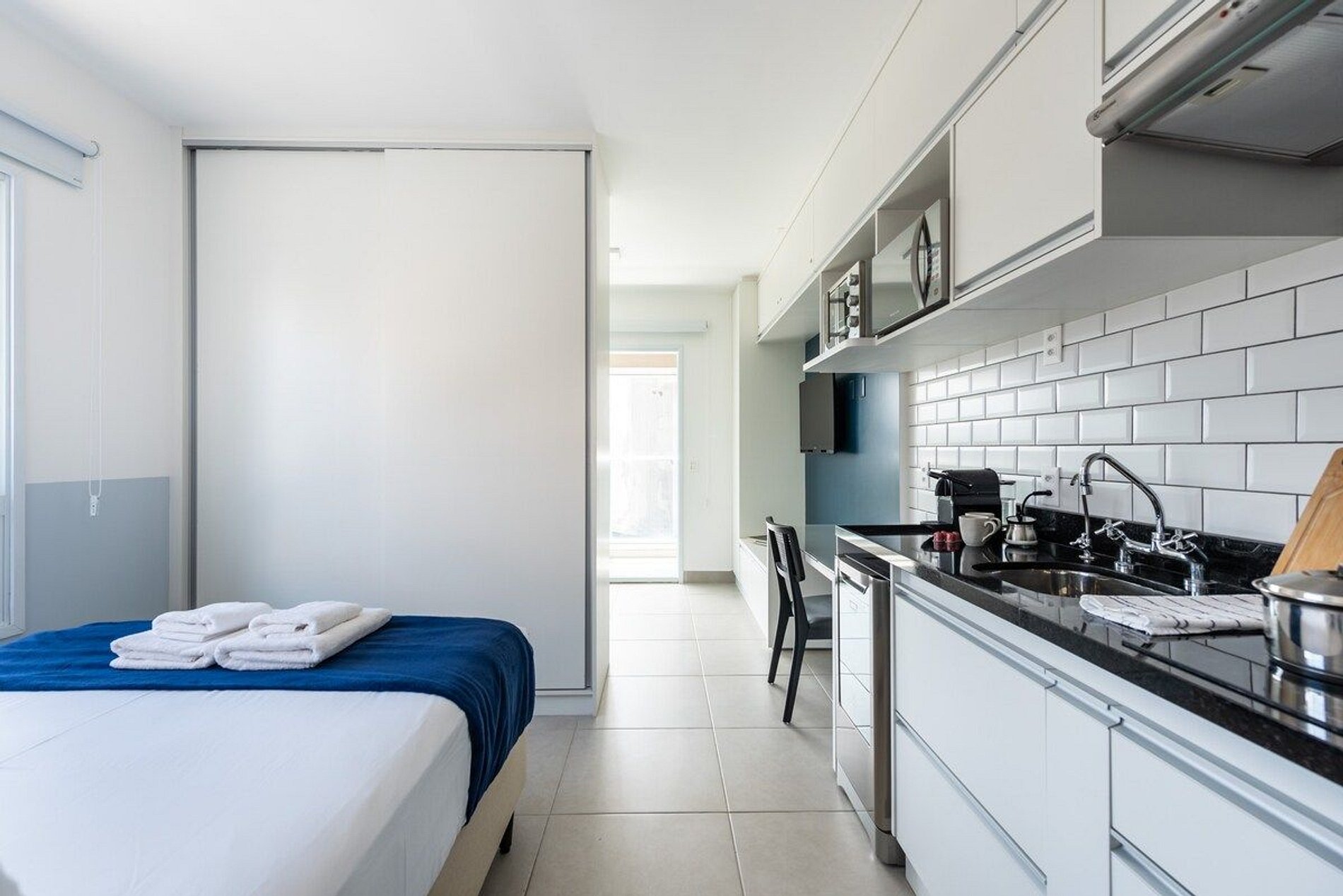 O nosso studio é completo para receber você em uma estadia de curta e longa duração. O apto possui cama de casal padrão, sofá cama de casal, cozinha completa com utensilio como airfryer, forno, fogão, lava louças, filtro de água, geladeira com freezer, microondas, cafeteira Nespresso, secador de cabelo, ferro de passar roupa, guarda roupa com cabides, entre outras comodidades que vão melhorar sua experiência.