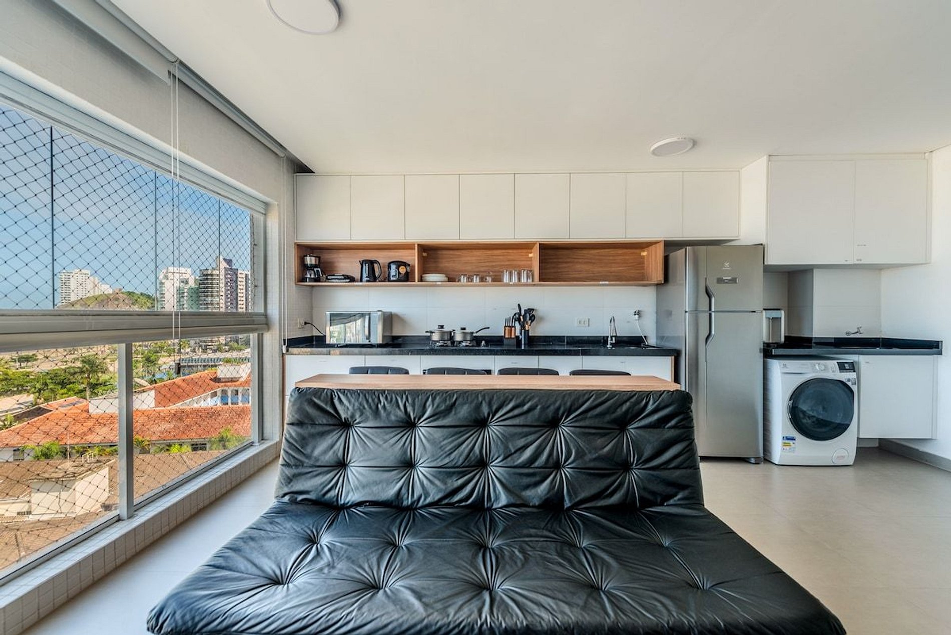 • Espaço para Trabalho e Refeições Rápidas em uma bancada confortável para quem precisa trabalhar remotamente.