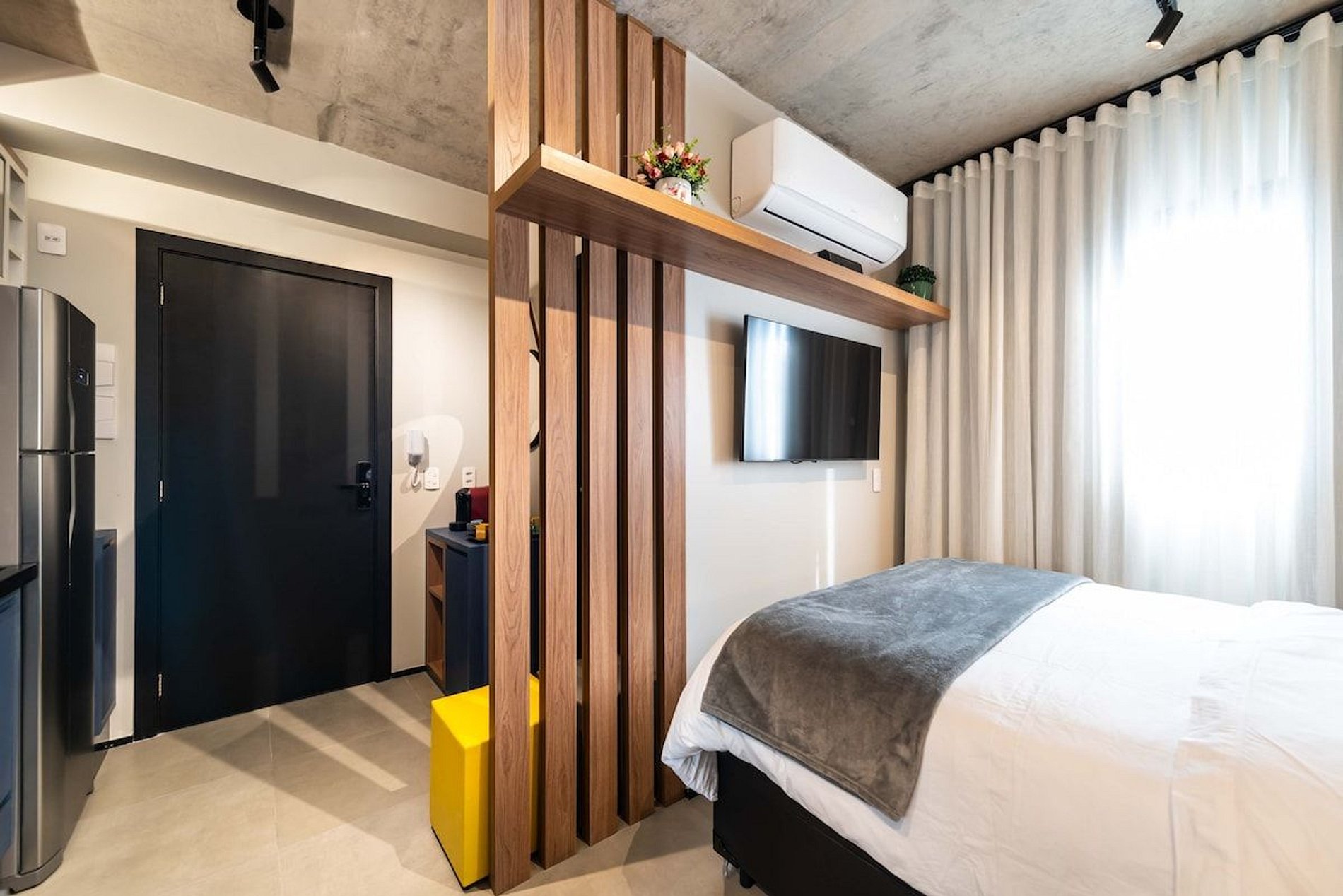 O Studio possui uma cama de casal padrão (1,38x1,88), TV Smart, geladeira com freezer, cozinha completa com fogão de indução (2 bocas), sanduicheira, utensílios de cozinha, panelas, taças de vinho, mesa de jantar, secador de cabelo, chuveiro (água quente e fria).
